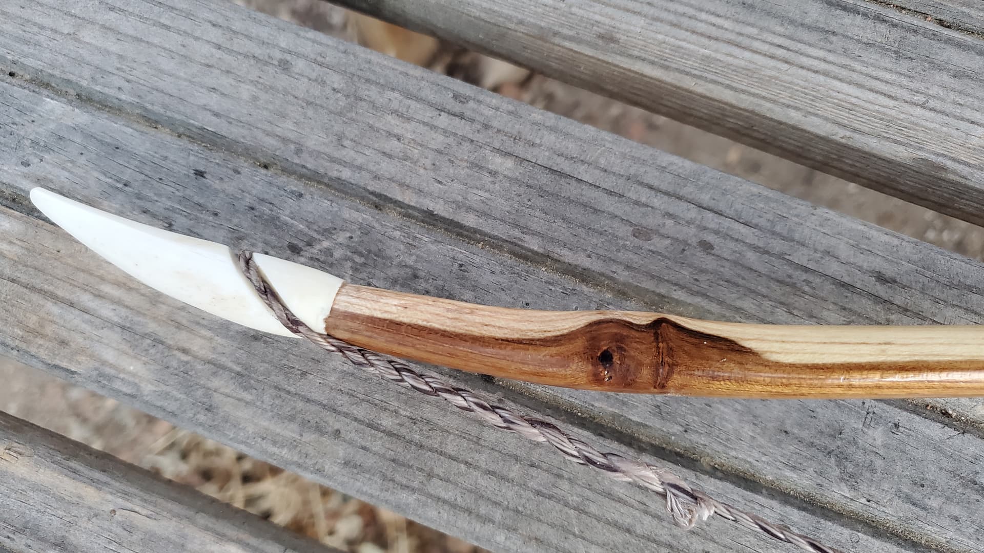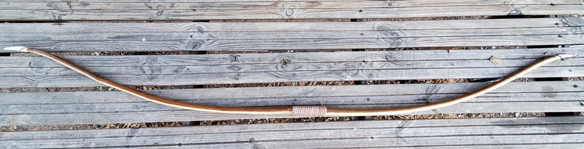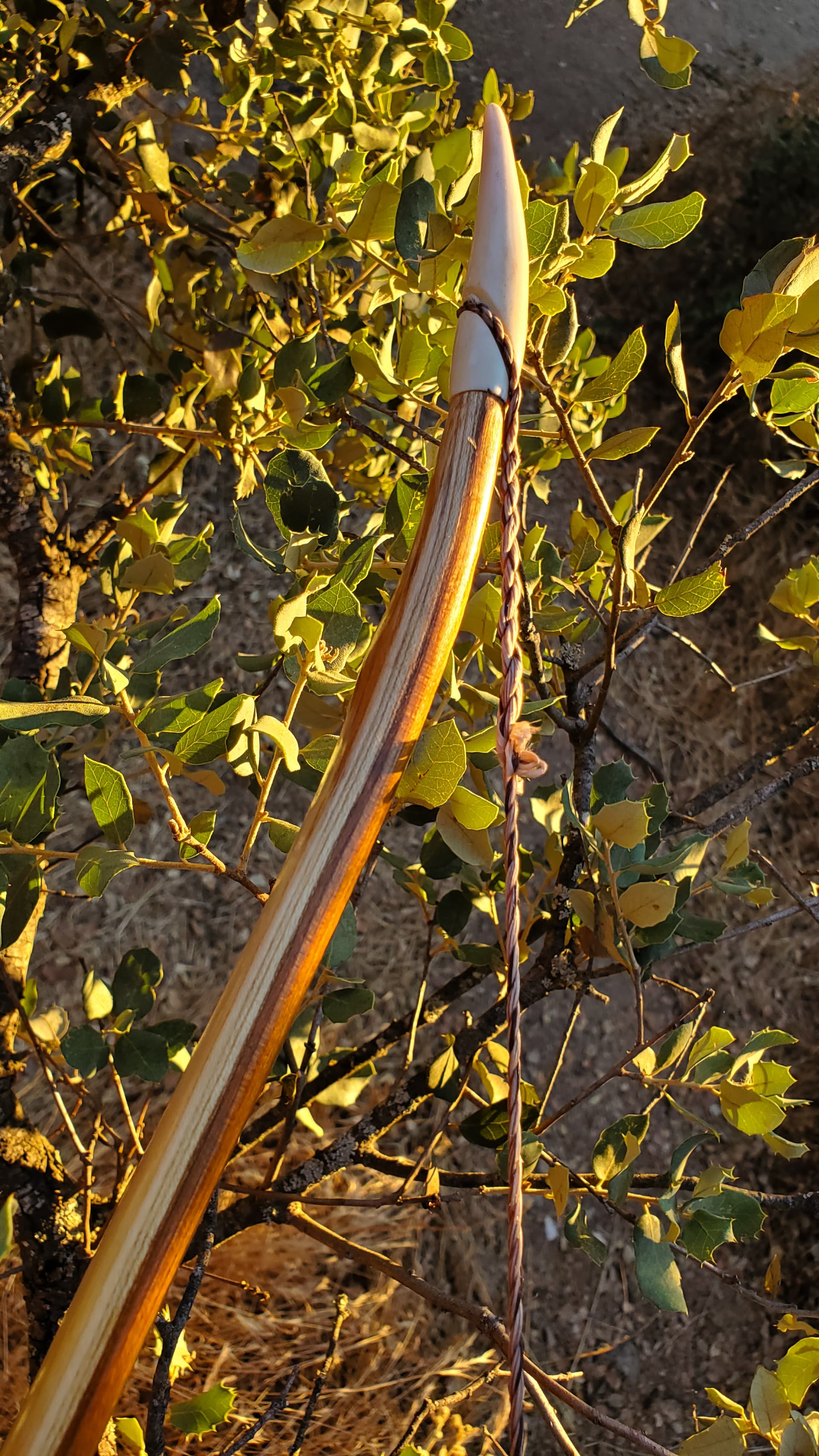 El arco es de una sola pieza de madera de Laburnum, aunque para el ojo no entrenado puede parecer tejo o, peor, ¡laminado! Esta posible confusión se debe a que, como el tejo, presenta tanto albura como duramen en la madera, otorgándole ese distintivo contraste cromático.