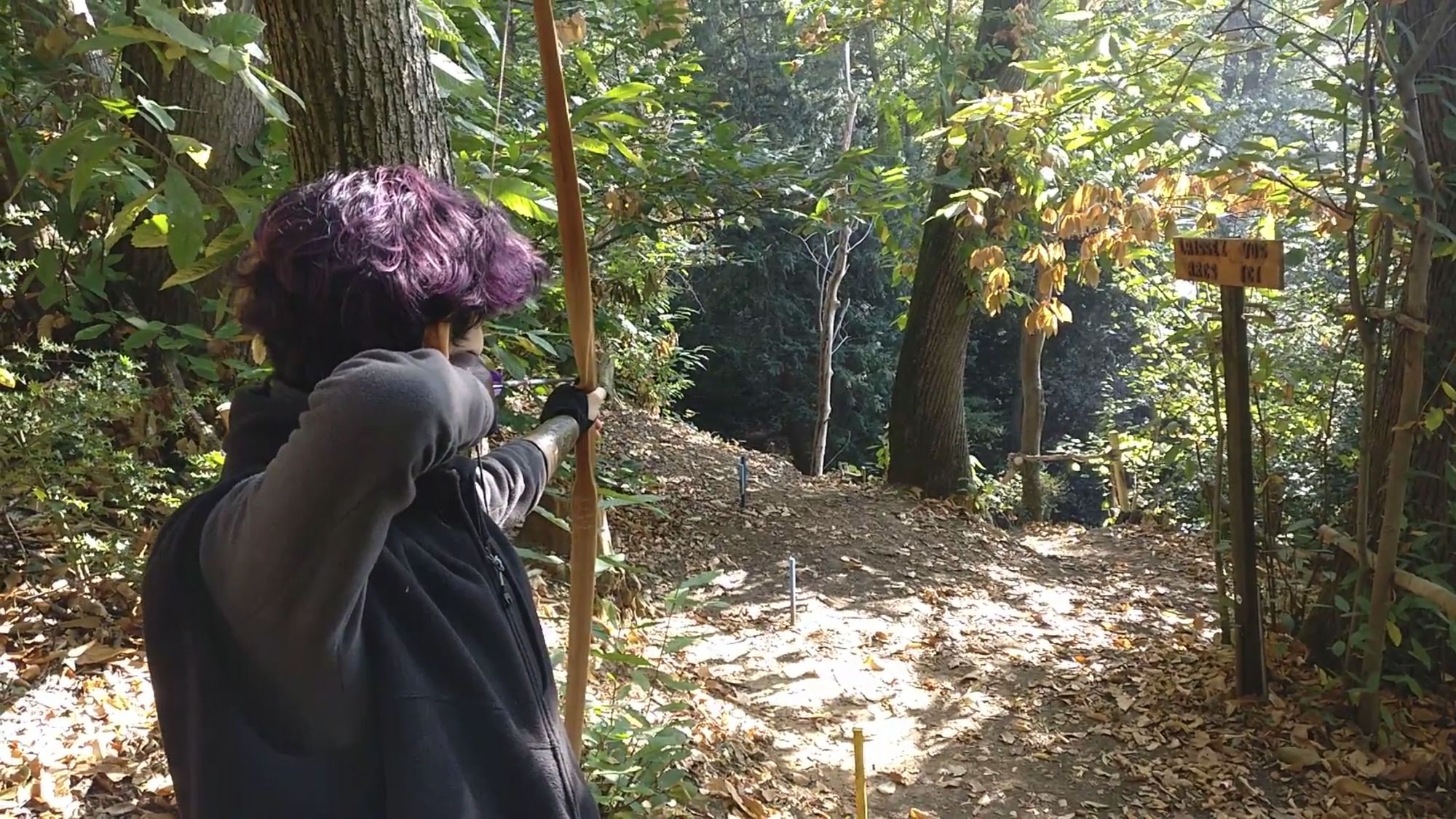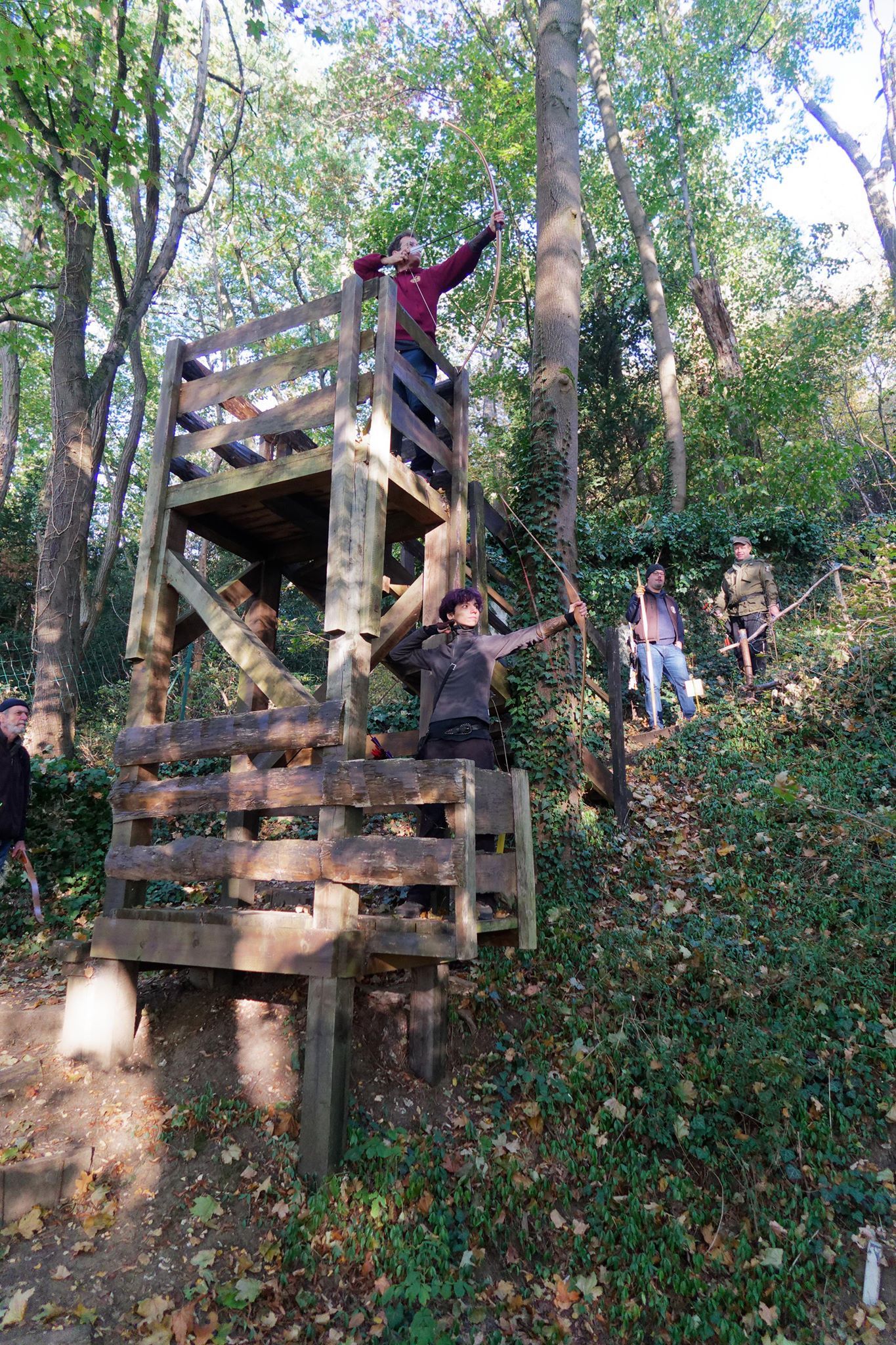Hubo un tiro especial, cerca del comienzo, que estuvo fantástico aunque fue muy complicado y a mí al menos no se me dio especialmente bien. Había dos posiciones de tiro, una arriba y otra abajo, diseñadas para poder tirarse simultáneamente sin riesgo de seguridad. Se trataba de una torreta de madera y para tirar cómodamente en la posición superior había que sacar el arco por fuera de las lamas de madera que hacían de barrera.