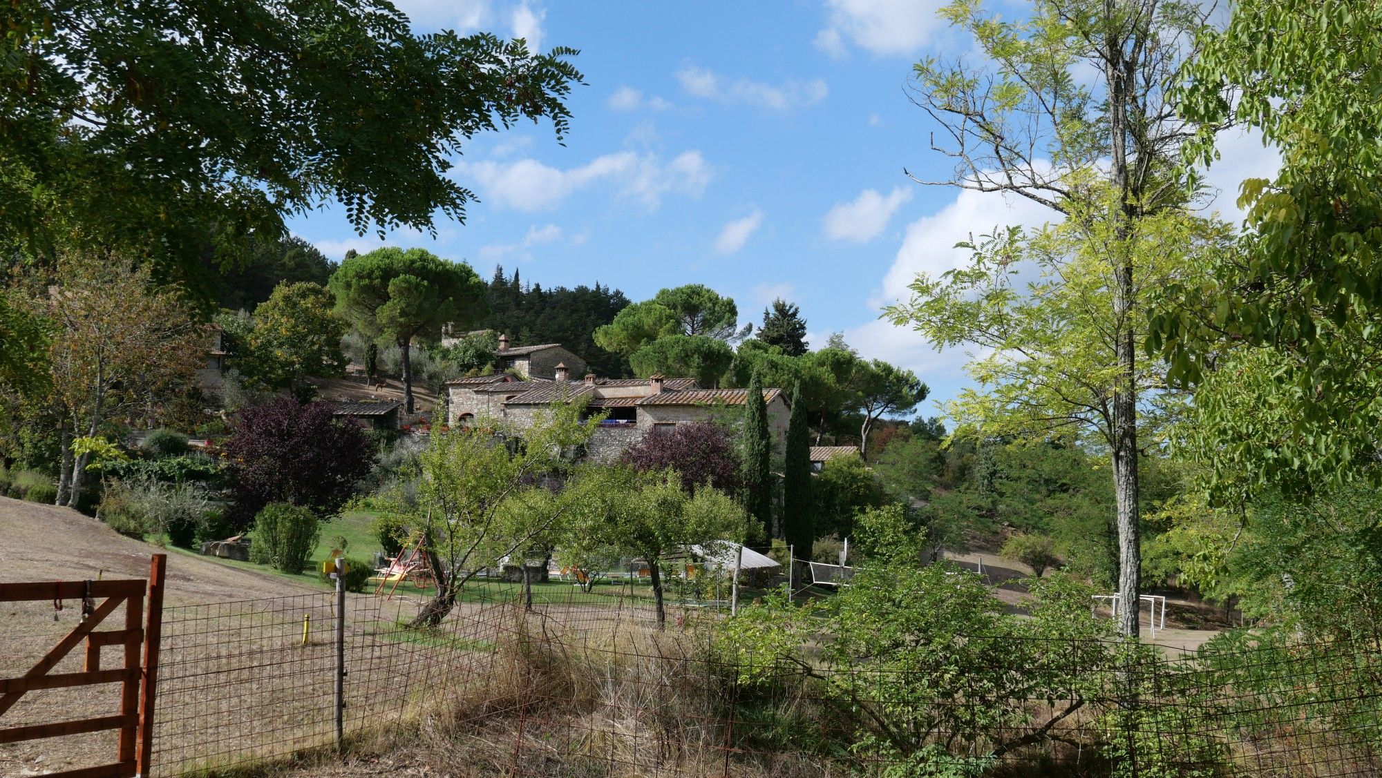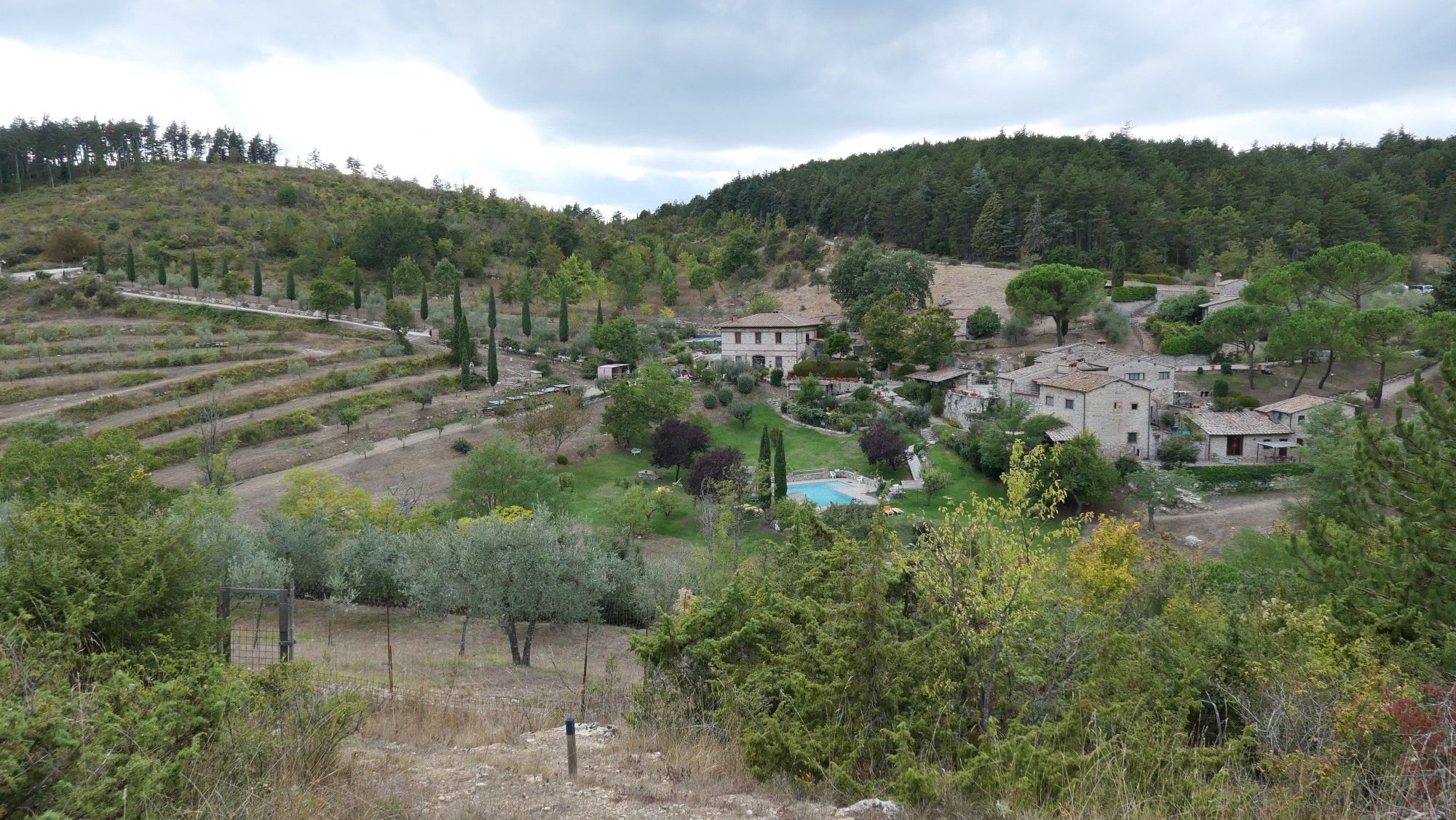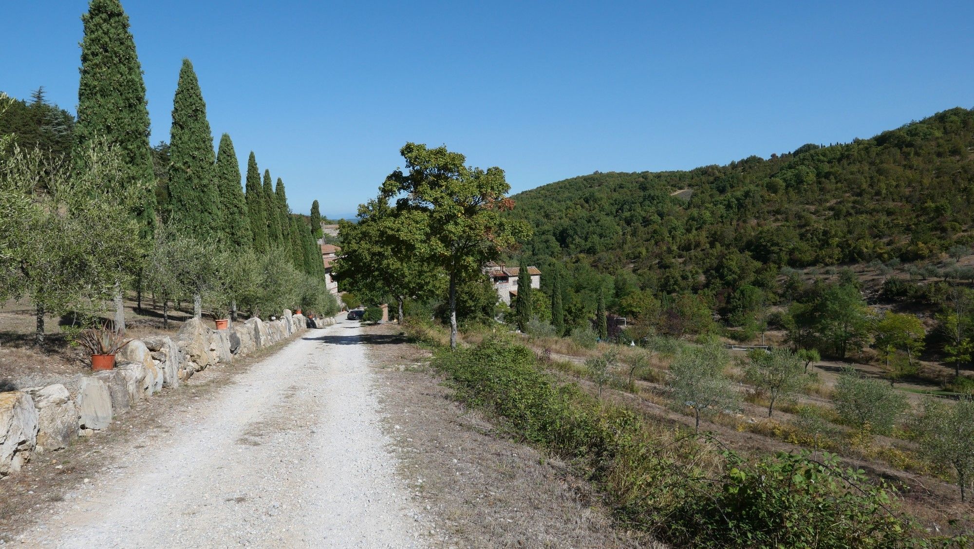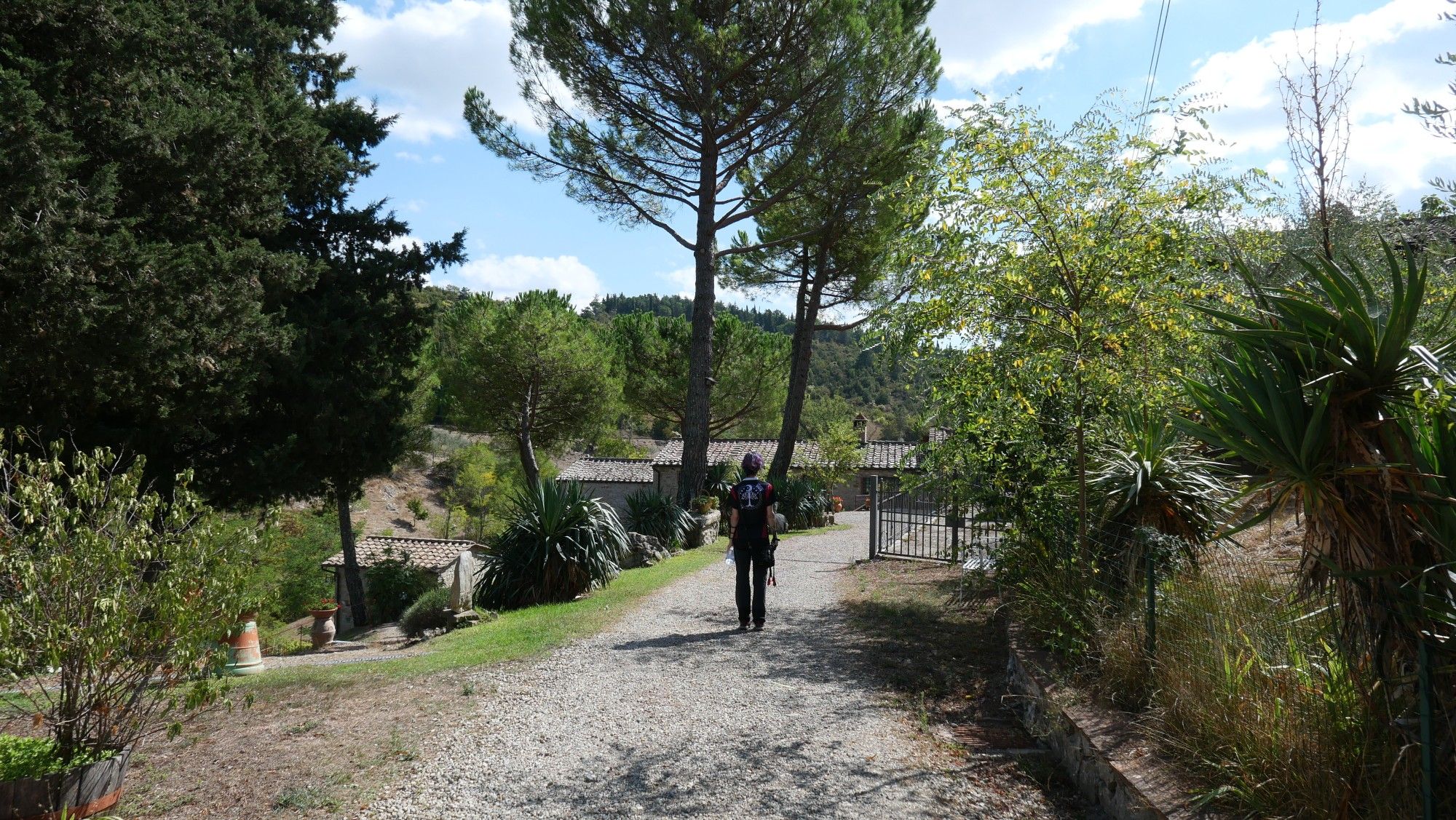 En un punto del recorrido hay un banco de madera para sentarse y disfrutar de las vistas que dan a la hacienda y las casas para alojarse. Así lo hicimos ya sin ningún miedo a que nos lloviera. De haberlo hecho con generosidad, tanto ese recorrido como el rojo matutino hubieran mostrado una cara mucho menos amable. Sin la lluvia, lo que quedaba era una luz vespertina ideal. Hay que pensar que cuando en Italia son las 5 de la tarde, su luz es la nuestra de las 6.