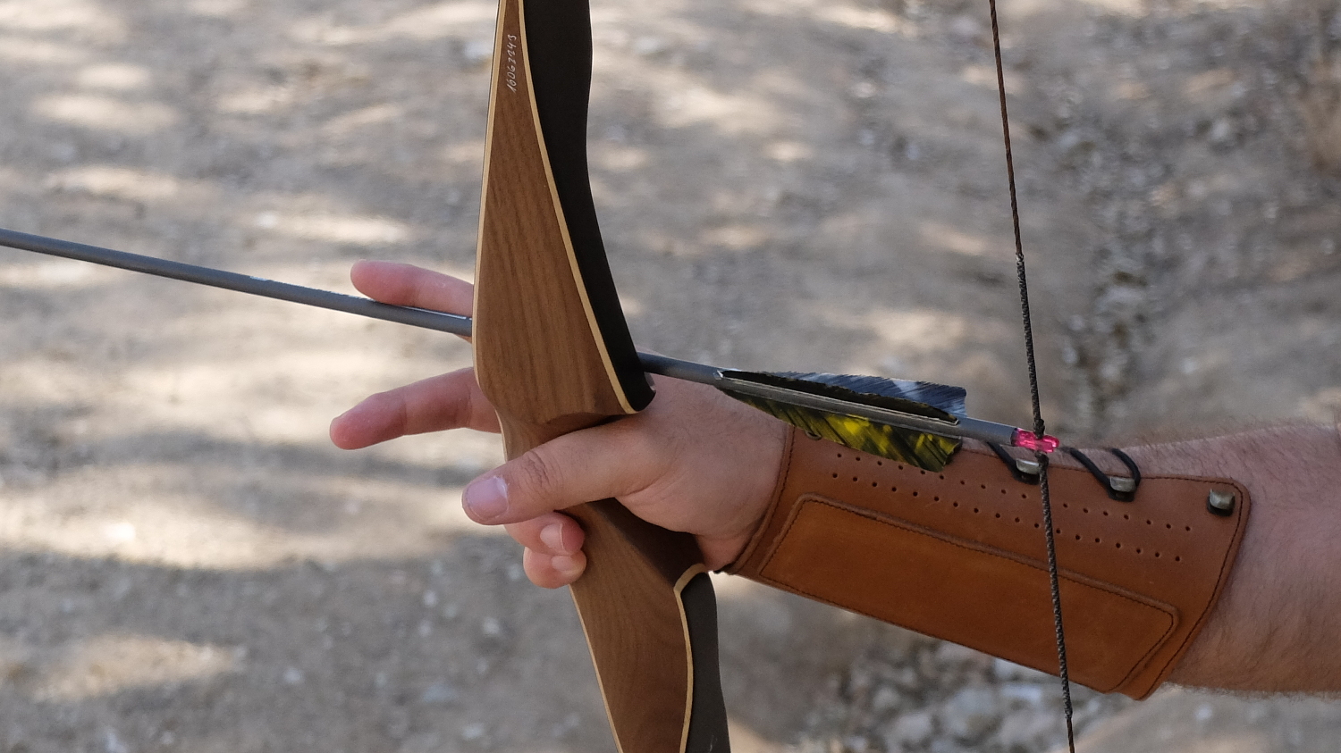 Hablando de la cuerda y su rendimiento hay que hacer un comentario importante. Desde que el agarre apache pasó a admitirse hace unos dos años, la mayoría de los cursos de iniciación emplean esta técnica para evitar errores de pinzamiento y mejora de la precisión. Le pasó a Borja en Arqueros de Madrid y también a Esther en el curso de la Federación de Madrid. Cada uno que tire como quiera pero hay que tener en cuenta que la mayoría de los arcos se diseñan pensando en el agarre mediterráneo o "split finger" y las vibraciones que la cuerda expresa tras una suelta pueden ser sensiblemente diferentes. El Grizzly Hunter Recurve no es una excepción y en un fistemelle de prueba de 7.5" se puede apreciar claramente en el sonido de la cuerda al soltar. Un agarre apache deja un "toing!" agudo que puede durar apenas medio segundo mientras que un agarre mediterráneo (a igual fistmelle) o no deja sonido en absoluto (buena suelta) o deja un cortísimo y más limpio "tin!".