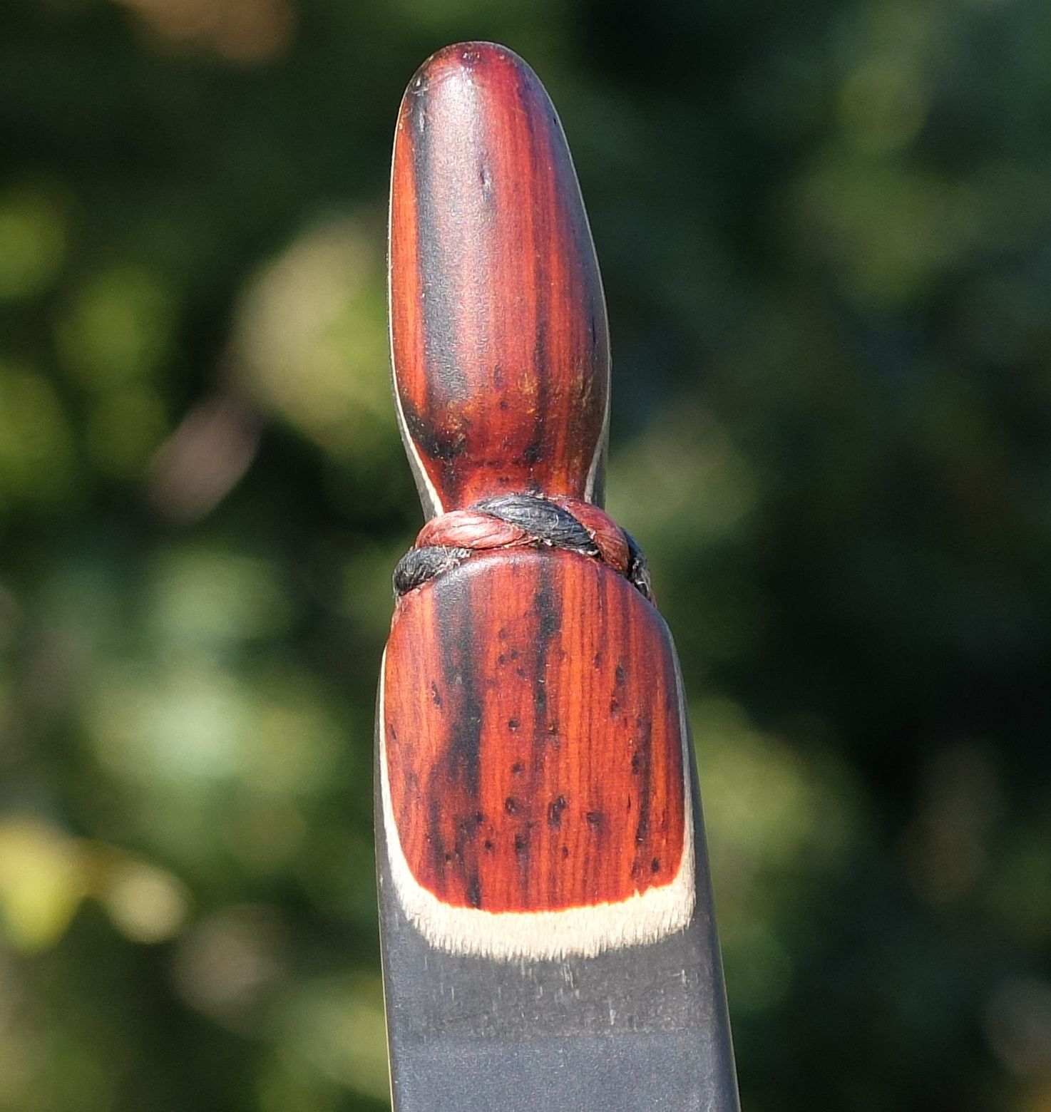 ¿Y cuál es esa configuración estándar-tope-de-gama? Muy sencillo. El cuerpo es de cocobolo oscuro, denso y estético, junto con dos piezas de una aleación de fibras y resinas pesada bajo el nombre comercial de Rockheart. El núcleo de las palas es de dos láminas de bambú separadas por una lámina de fibra de vidrio. El frontal de las palas es de fibra de carbono, concretamente lo que Falco llama "Diamond Carbon". Hay otra lámina de carbono en la parte posterior y finalmente una elección estética de la madera. Para esa elección estética opté por ébano con unos adornos de cocobolo en el nacimiento de las palas. Todo para un peso total de 880 gramos, 200 gramos más que el Falco Force de 66" pero lejos del kilo "largo" que está de moda en los recurvos últimamente.