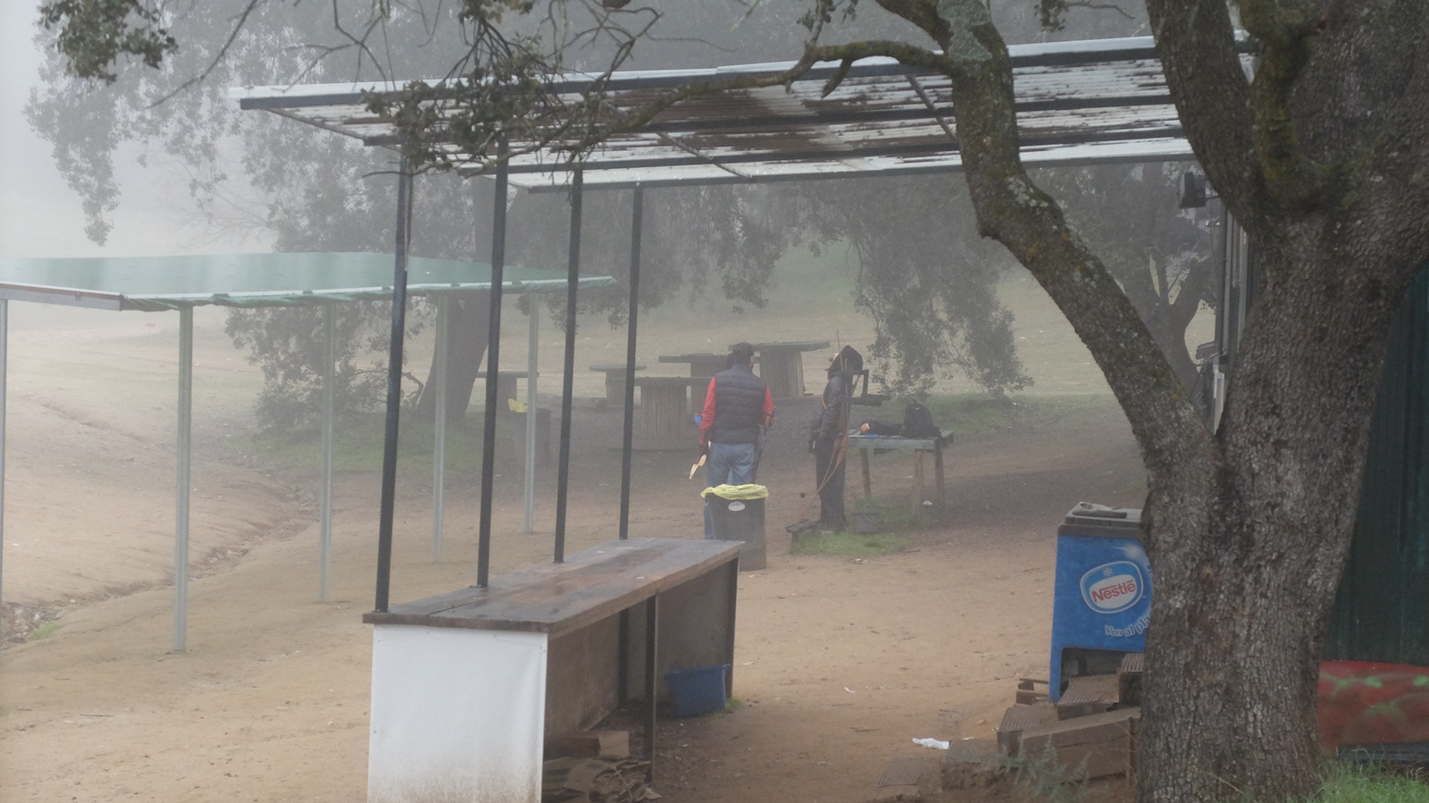 A las 10.30h nos encontramos en el aparcamiento para abonados del club los dos coches y tras montar los arcos estuvimos calentando un poco. El campo estaba precioso. Muy silencioso (pocos coches pasaban por la A-1 a esa hora) y todo cubierto de niebla. El vaho al hablar delataba un ambiente frío pero íbamos todos con las capas que considerábamos adecuadas para temperaturas en torno a los 7-8 grados y las flechas volaban igual de bien.