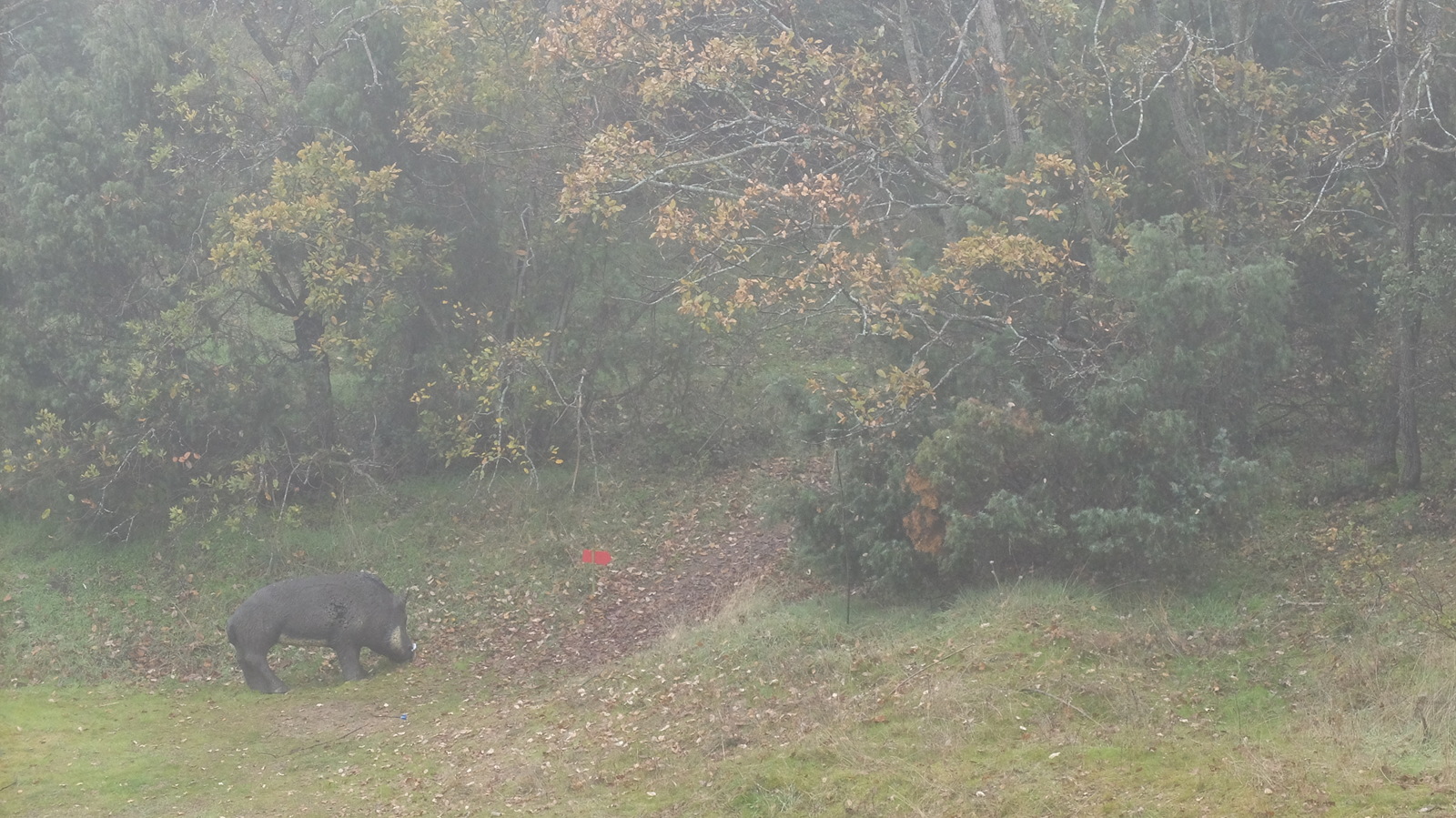 Este recorrido que lleva dos o tres semanas y que ha sufrido algunos cambios los últimos días es particularmente bonito y agradable. Como es tradición en el club, transcurre por dos vaguadas contiguas unidas por una repecho longitudinal que en su punto más alto permite disfrutar de las vistas de toda la zona (cuando no hay niebla, claro). Las propuestas de las vaguadas suelen ser tiros inclinados hacia arriba o hacia abajo con distancias largas, apurando en muchas ocasiones los límites de la normativa, pero sin apenas obstáculos en el vuelo de la flecha. El resto de las dianas, en el repecho, más frondoso, y en los ascensos o descensos a las vaguadas, suelen estar magníficamente enmarcadas por árboles de la zona (encinas, sobre todo) y con la vegetación, si no florida por no ser primavera, al menos densa y generosa. Hay unos tiros a algunos jabalíes, linces u osos así como un cervatillo y a la oca que son fantásticos. Mis dos favoritos son uno antes del ecuador a un lince con un efecto túnel de una gran encina a medio camino para el que es mejor tirar de rodillas y esquivar una traicionera rama y un jabalí en tiro lejano y hacia abajo desde la piqueta roja, en un pequeño claro rodeado de varios señores árboles que cubren totalmente el cielo.