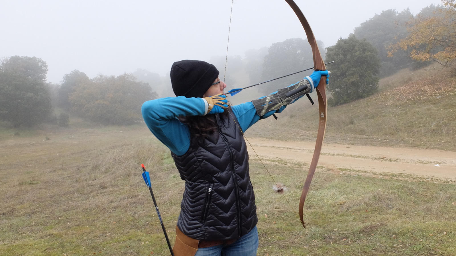 Siendo cuatro, un recorrido relajado puede llegar a durar 2 horas largas así que en cuanto tiramos 3 rondas de flechas de calentamiento ya estábamos de camino a la primera diana del nuevo recorrido fijo que han montado tras la Tirada de Navidad. La consigna de la mañana era clara; anclajes largos. Como grupo de dos arqueros y dos arqueras y técnicas y arcos diferentes es más fácil elegir aspectos fundamentales de la técnica y ayudarnos mutuamente. ¿Por qué no elegir algo tan sencillo como un anclaje sólido que dure 2-3 segundos? Dado que no tenemos arcos de más libras de las que podemos aguantar cómodamente 5-6 segundos (repito, cómodamente), esos 2-3 segundos solo van a facilitar mayor concentración, mayor autoconsciencia previa al tiro y menos precipitación en la suelta. Además, es la vacuna perfecta para el snap-shooting, esa forma de tirar que consiste en soltar en cuanto se alcanza el punto de anclaje y que al cabo de semanas y meses se convierte en una suelta anticipada cada vez más y más temprana.
