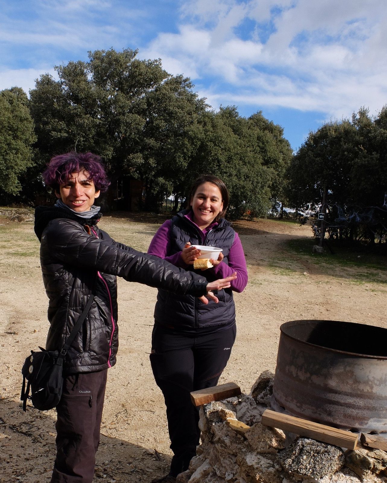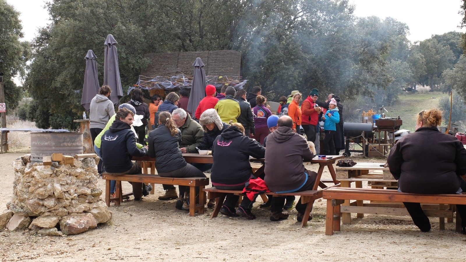 Cuando llevábamos una hora y se nos estaba haciendo un poco cuesta arriba el tapón de patrullas, optamos por hacer un descanso e ir a comer. ¡En qué buena hora! Llegamos justo en el momento en el que sacaban el perolo con la caldereta que nos sentó divinamente. Aunque el día no era particularmente frío, sí que sentíamos el "frescor" ante la ausencia de un sol insistente y cada trago del caldo calentito nos arrancaba una sonrisa. Flechas y caldereta, es todo lo que pedimos (en otoño), jajajaja.