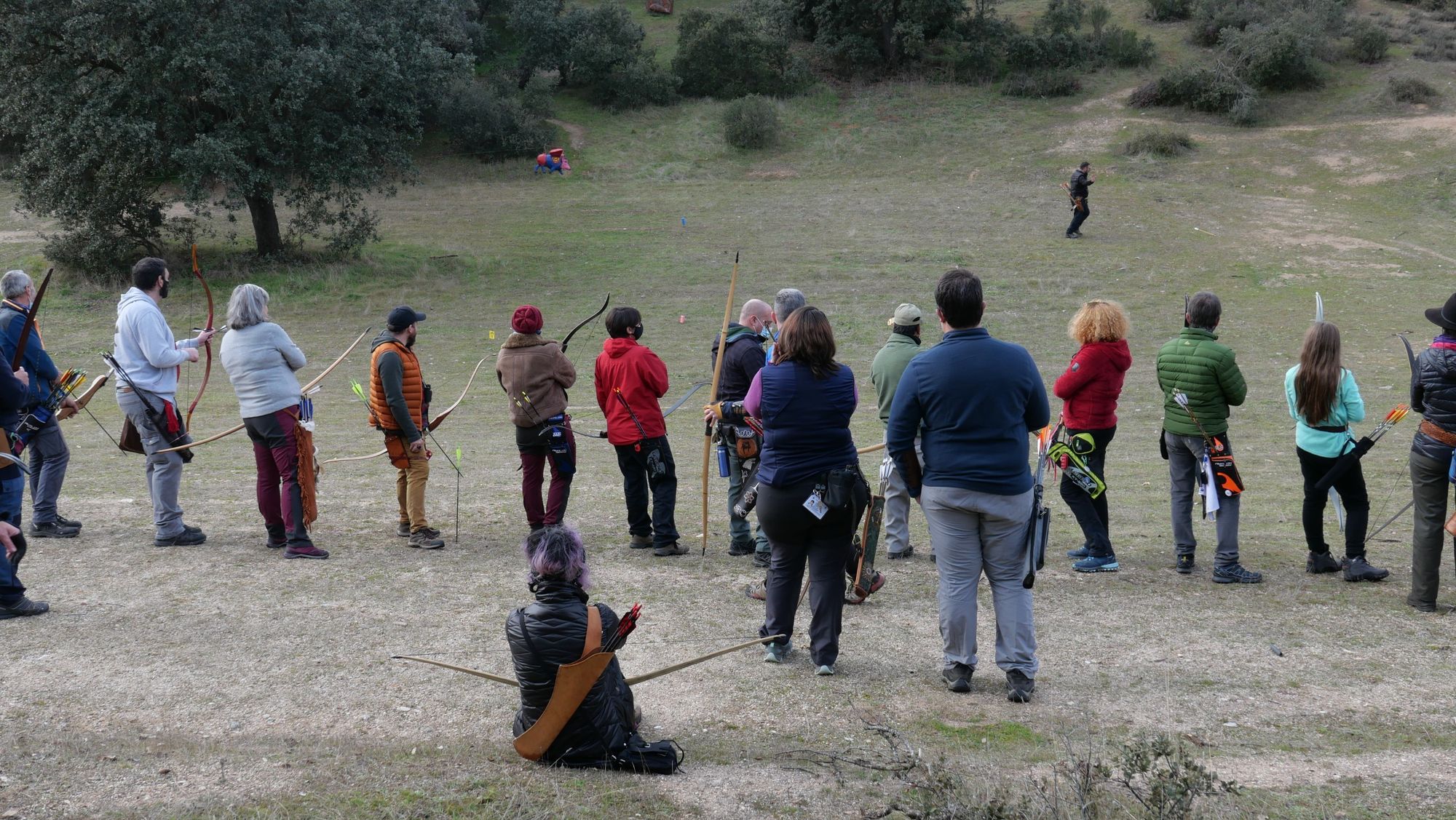 Terminamos sobre las 14.20h y rápidamente nos pasterearon para una de las vaguadas habilitadas con "los juegos". Estos juegos suelen consistir en un tiro a muy larga distancia (3 flechas por persona), un tiro al mono-chapa (1 flecha por persona) y diana-tirolina. Este año, además, había otra diana grande pendida de la rama de una de las encinas más bonitas de la finca del club pero no llegué a participar y no sé en qué consistía aunque creo que era una diana rotante.