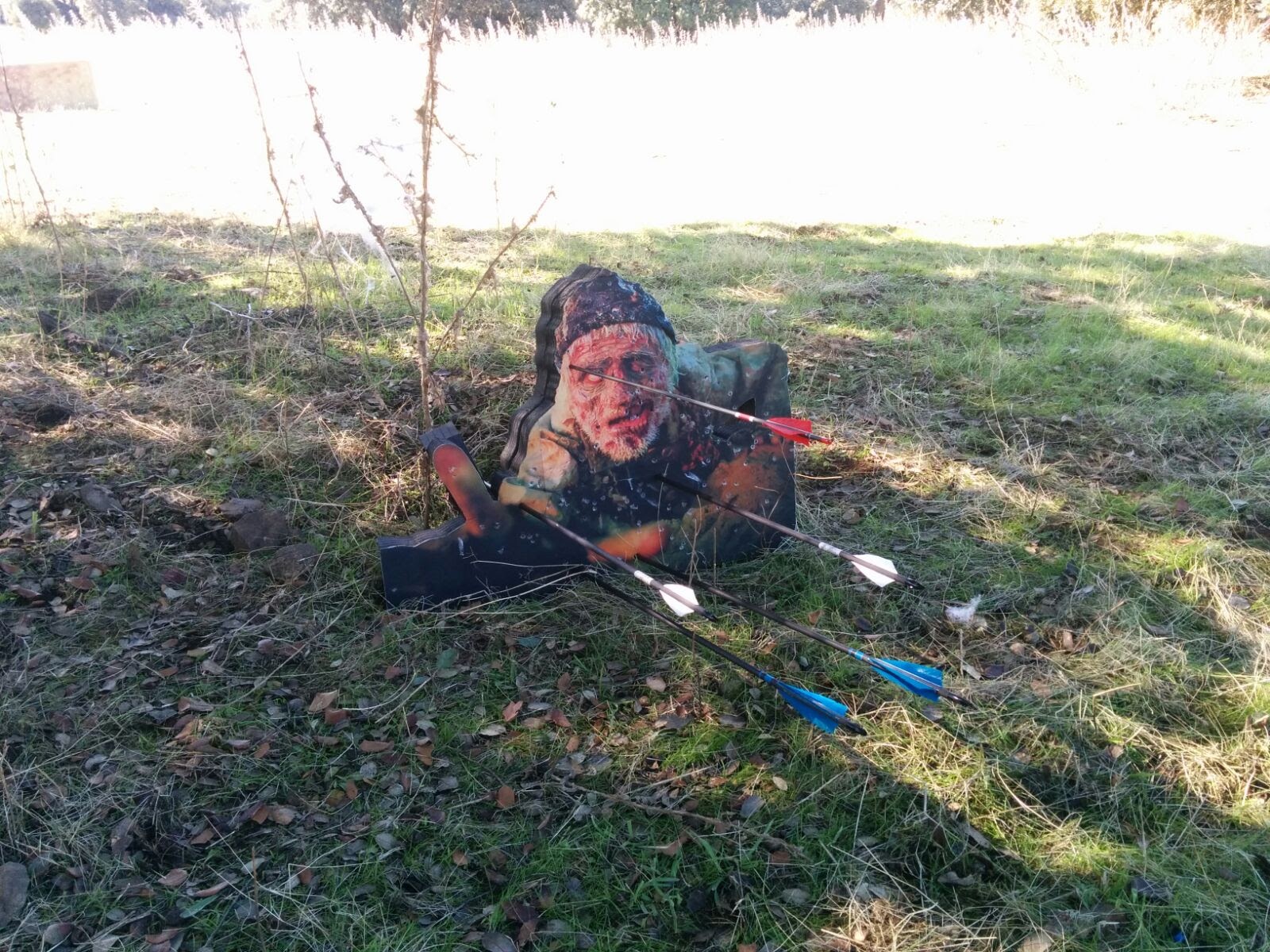 Esta vez nos acompañó Juan, que tenía ganas de tirar contra zombis y estrenarse con flechas de madera con su Falco Legend. Cuando llegamos sobre las 12.30h al club la zona de aparcamiento estaba abarrotada de coches. Aparcamos en un hueco como pudimos y tras montar los arcos nos fuimos saludar a la gente, vernos con Juan y pedir las tablillas de puntuación.