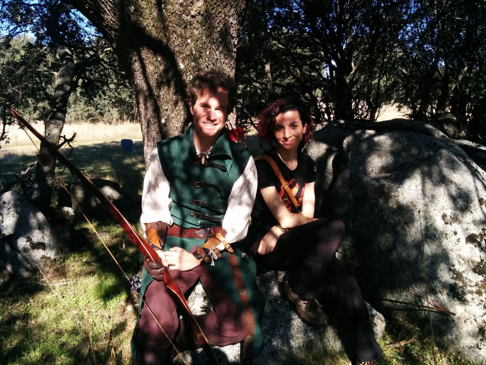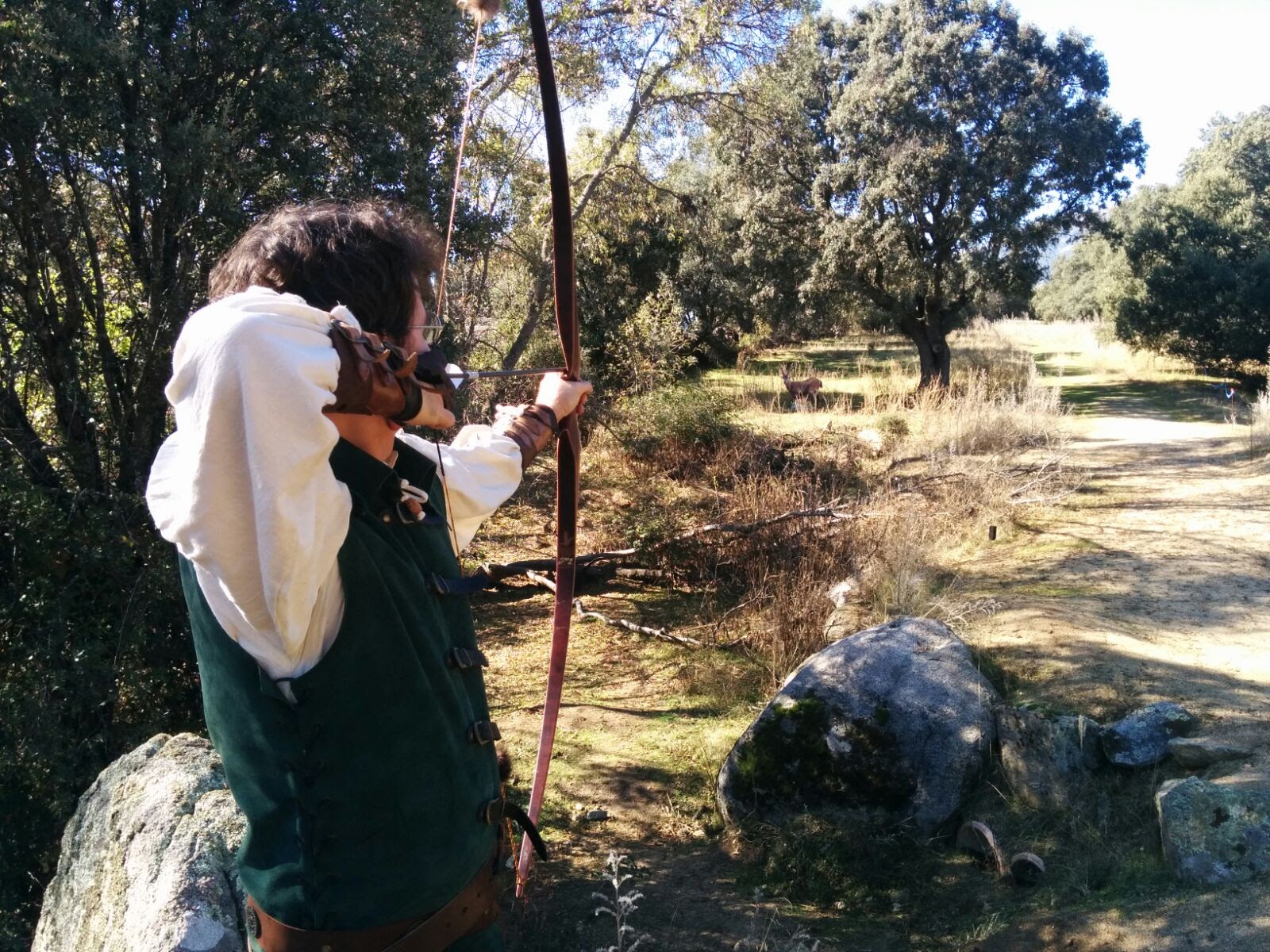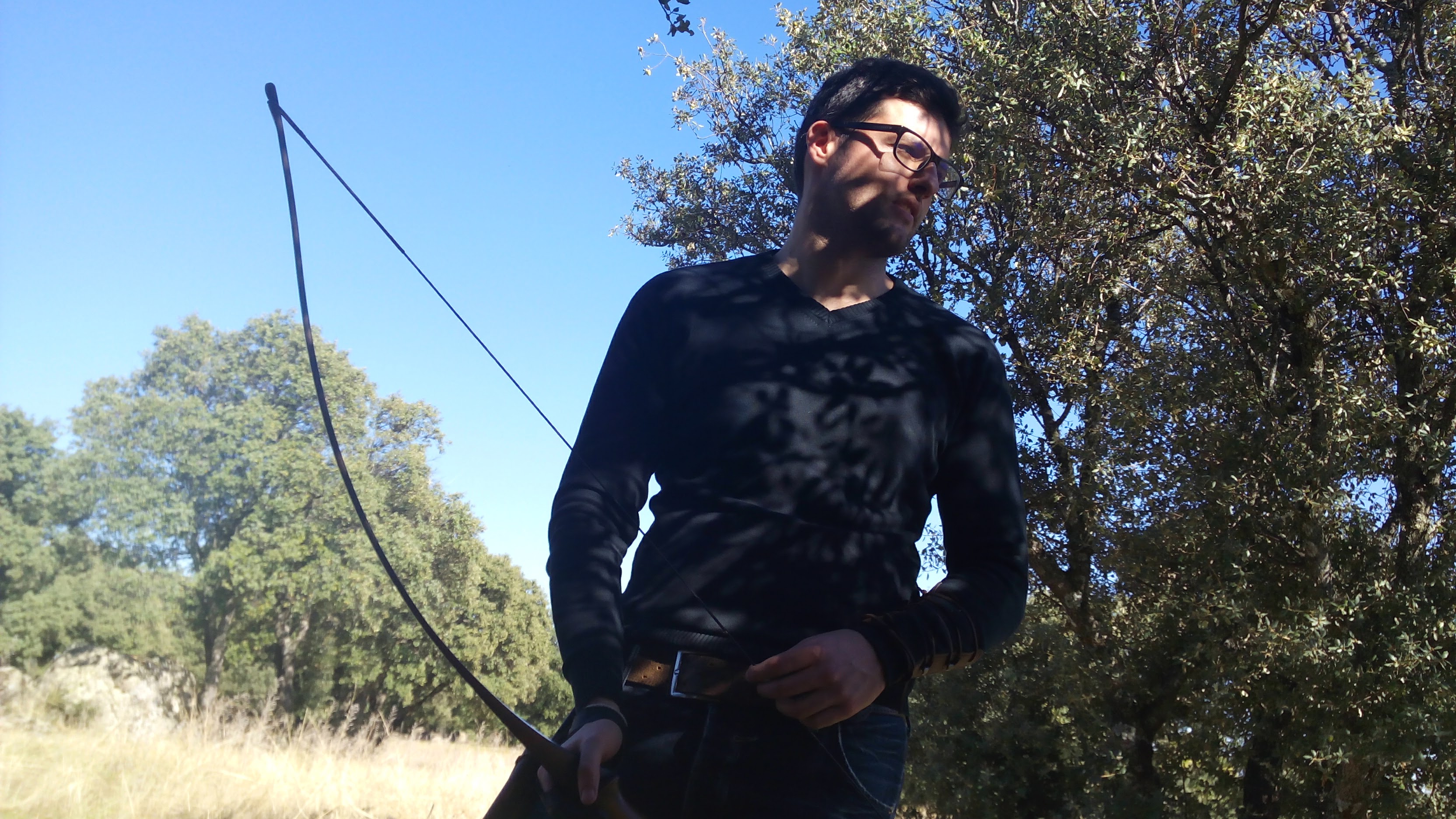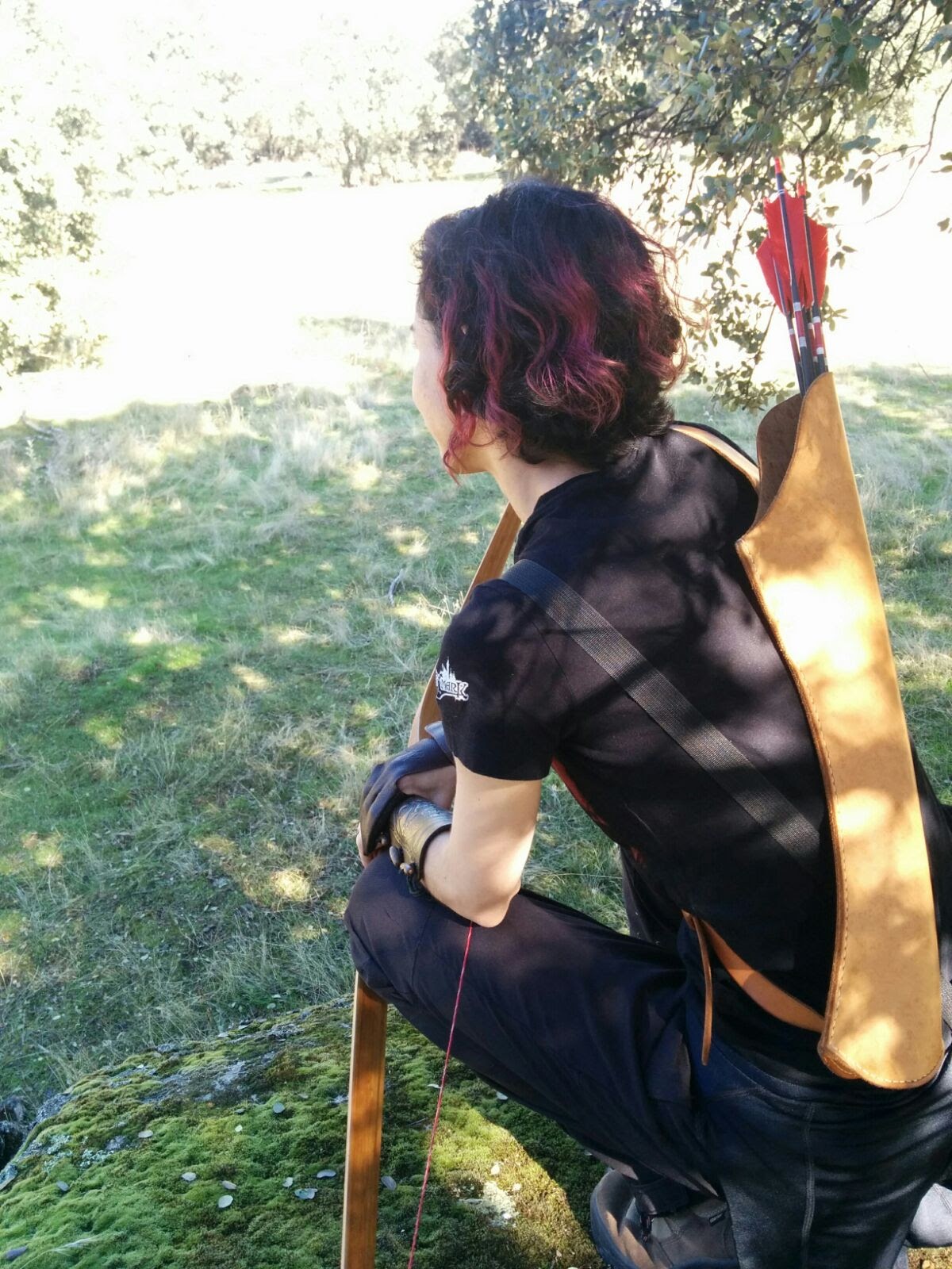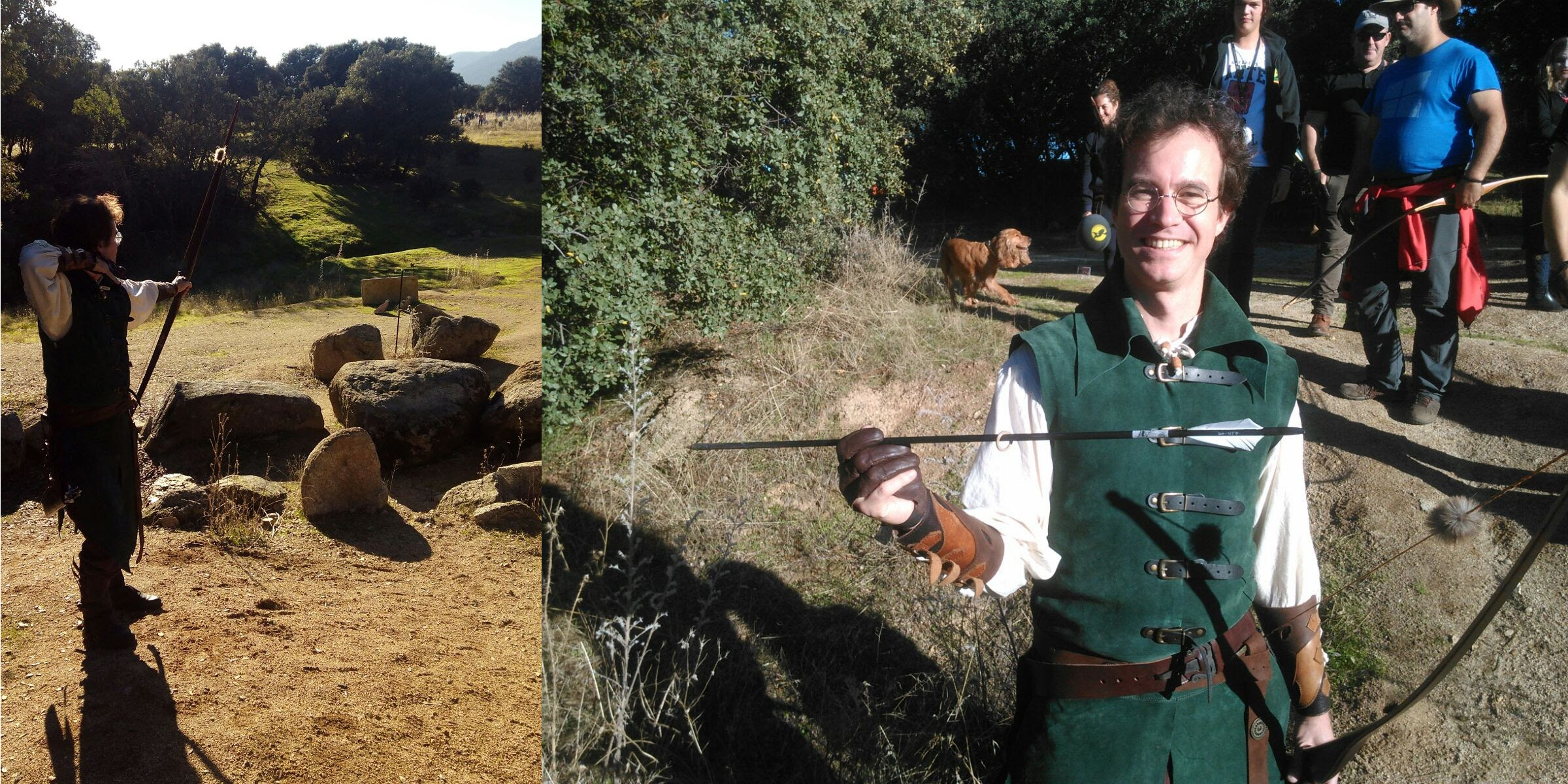 Yo no tenía claro si participar tirando más allá de dar los dos euros porque con un longbow y flechas de madera y viendo que habían colocado el euro sobre una estaca de plástico a unos seis o siete metros y con el sol de frente, era más probable que la flecha se perdiera o se rompiera contra alguna piedra que otra cosa pero al final me animé, volví a ponerme el guante, me ajusté la aljaba con mis flechas y descolgué el arco del soporte de madera.