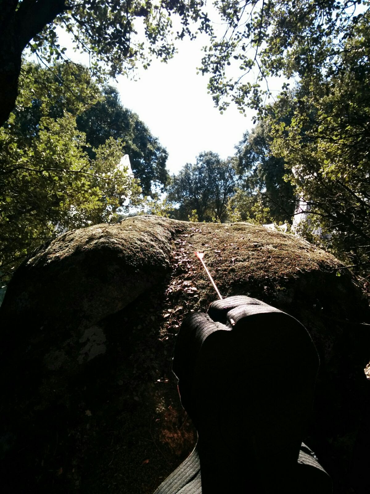 Pero es igual lo que Juan o yo consiguiéramos con tiros más o menos complicados, fue Angela la que se llevó la ovación unánime cuando se enfrentó a una diana muy especial. Subida a una roca debía disparar su flecha hacía una diana completamente tapada por una enorme roca más lejos y hacia abajo. Cuando digo completamente tapada me refiero a que solo sobresalían tres dedos de la cabeza del zombi. La frente y su cabello enmarañado. El cartel decía "dispara en cuanto asome la cabeza" así que parecía una diana-reto muy especial. A la dificultad de dar a una franja tan pequeña (5 cm de alto por 15 cm de ancho) a una distancia de unos 12 metros se sumaba el hecho de que si la flecha se iba mínimamente por abajo, podía romperse sin dificultad impactando directamente en el peñasco.