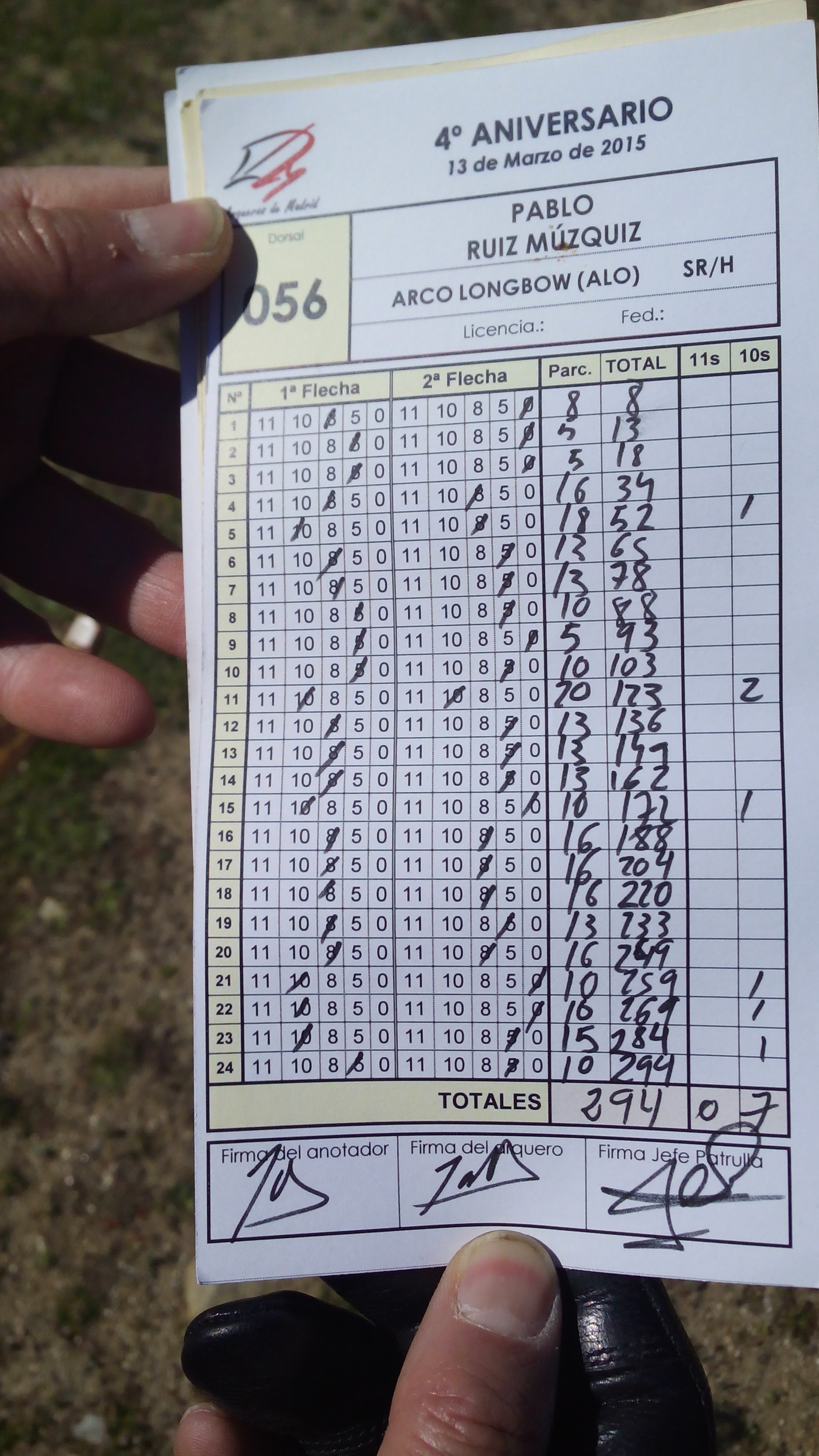 Quizá por eso me sorprendió más aún cuando un compañero de patrulla del año pasado me fue a buscar para decirme que había quedado primero. ¿¡Hola!? ¿Primero con la gente que se había apuntado? Casi se me atraganta la panceta pero de alegría, claro. Efectivamente, mis 294 puntos me dejaban como primero en Longbow SR/H de un grupo de unos 10 tiradores.