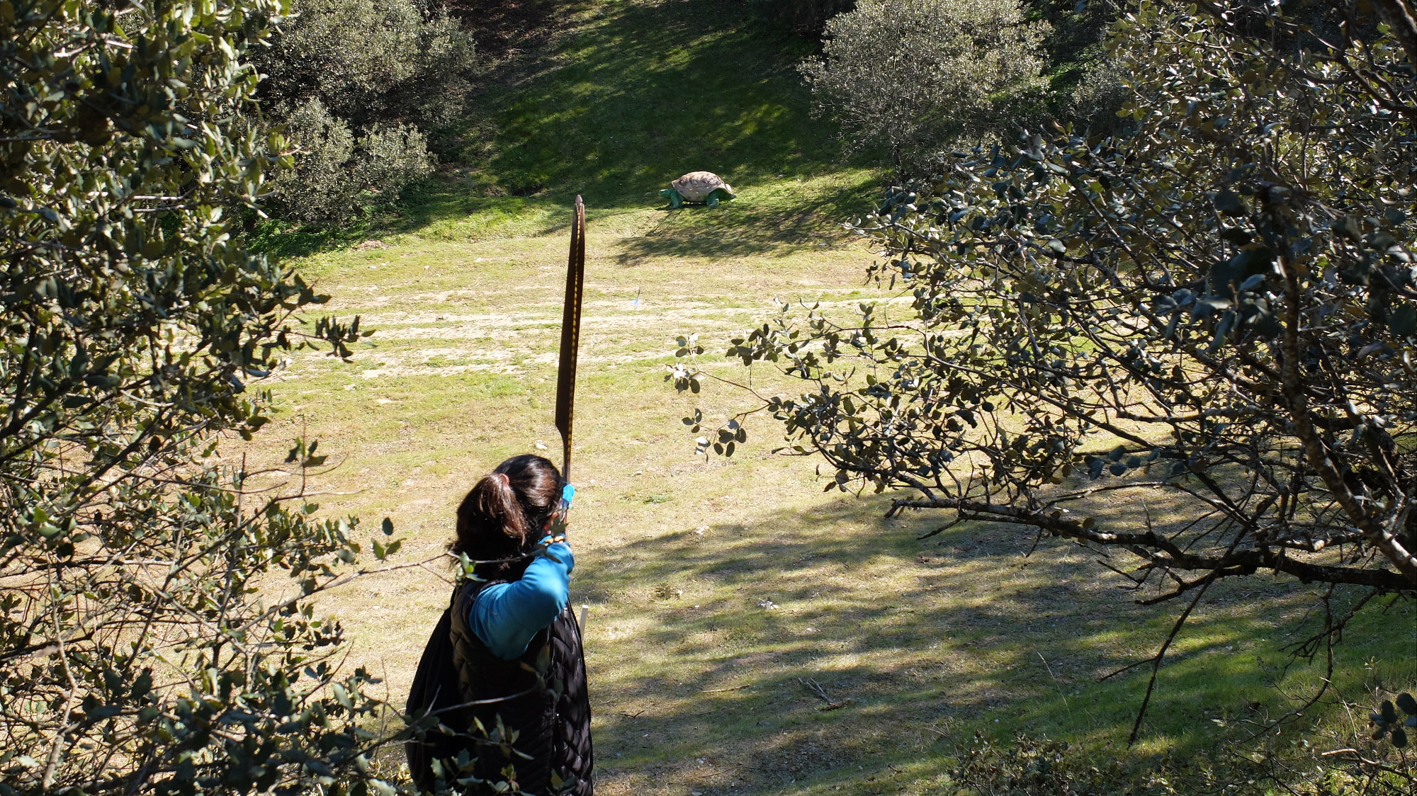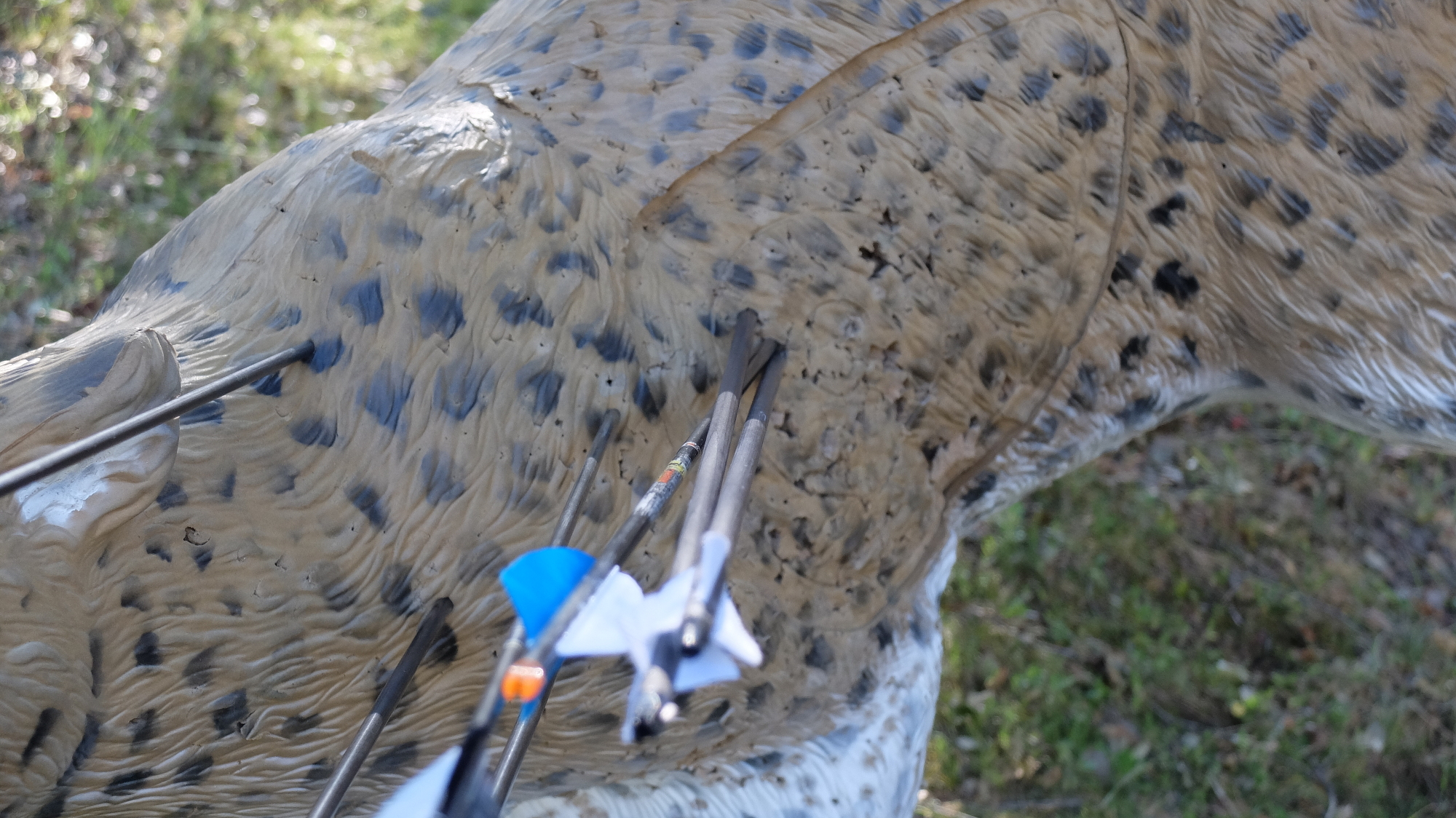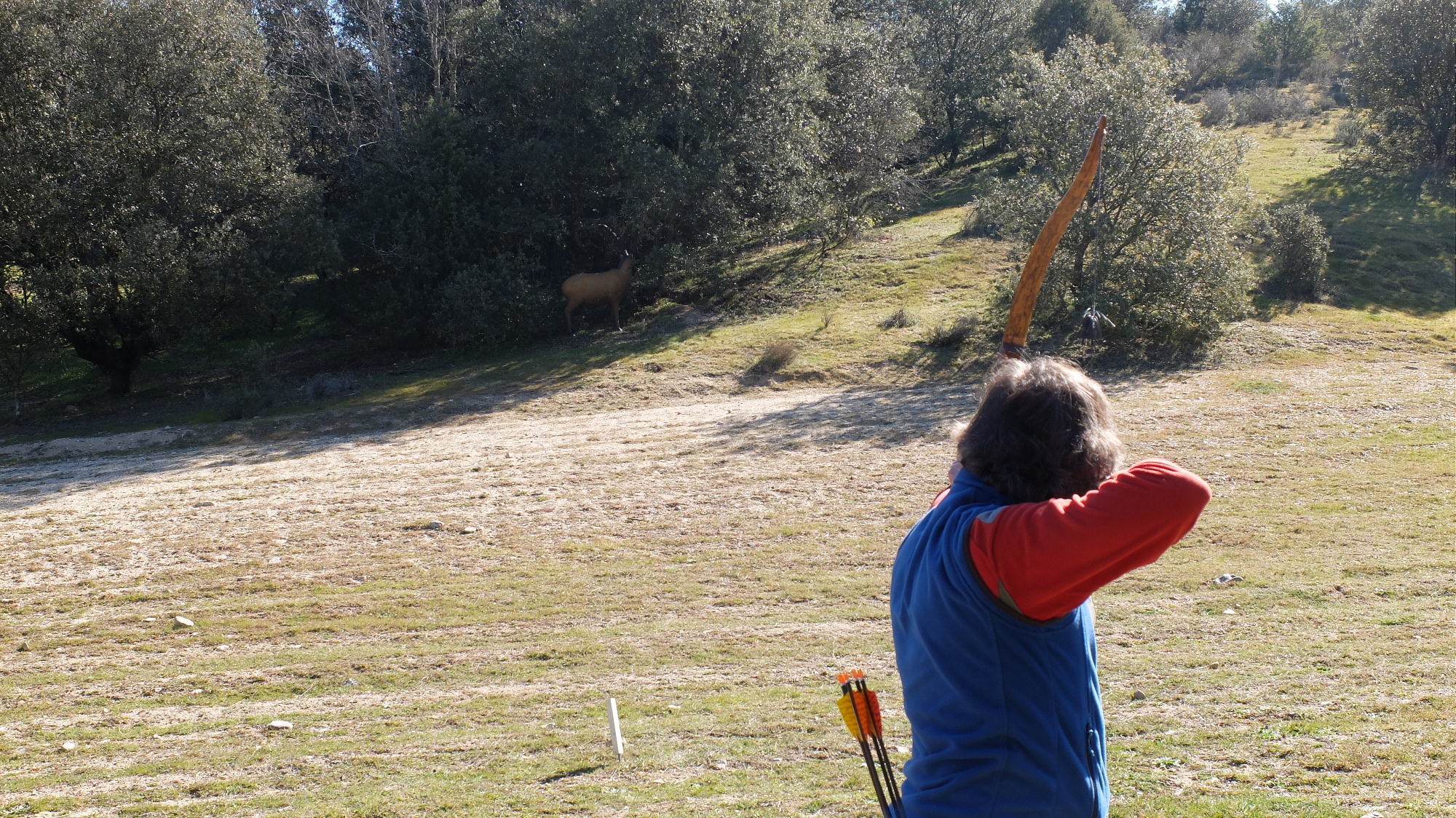 Una cosa que hice conscientemente este día fue no exactamente un cambio en mi técnica pero sí un ejercicio muy consciente para tener una consistencia en la forma de alinearme. Consistió en colocarme de forma que el corazón del animal quedara situado en el centro de mi pupila izquierda al quedarme colocado y orientado en lugar de más escorado a la izquierda de mi visión. Esto me dio un toque menos perpendicular a la diana, muy leve, pero con el que quiero jugar las próximas semanas. Consiste en plantarme en la diana de frente, ubicar el punto al que quiero tirar con mi ojo izquierdo y luego girar todo mi cuerpo hacia detrás con esa referencia fija.