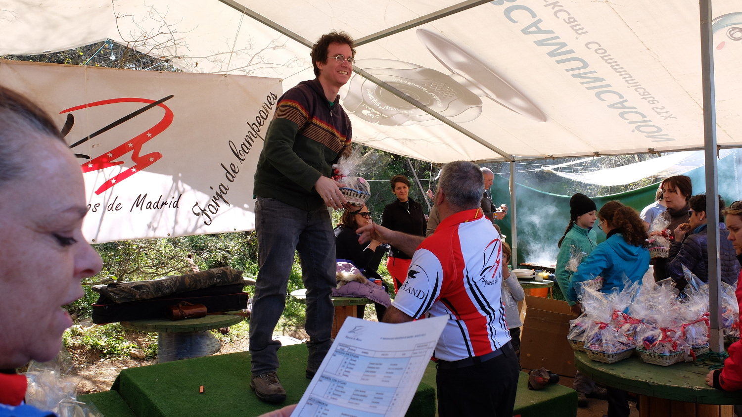 Tomando el premio (una preciosa cesta con un surtido de patés y confituras) de manos de Juanjo, presidente de Arqueros de Madrid (luciendo la enseña de campeón mundial de IFAA en arco mecánico, por cierto)