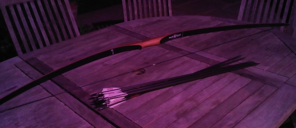 Angela y yo siempre hemos querido poder ir a alguna tirada nocturna pero al final las fechas nunca han encajado. Ayer por la noche, sin embargo, decidí tirar unas cuantas rondas con el nuevo arco Buck Trail Black Hawk antes de volver de Londres a Madrid. Para ello, puse la diana con el póster de un zombi de 65cm de alto en el jardín de la casa y dejé encendida una luz del porche que apenas lograba adentrarse en el césped.