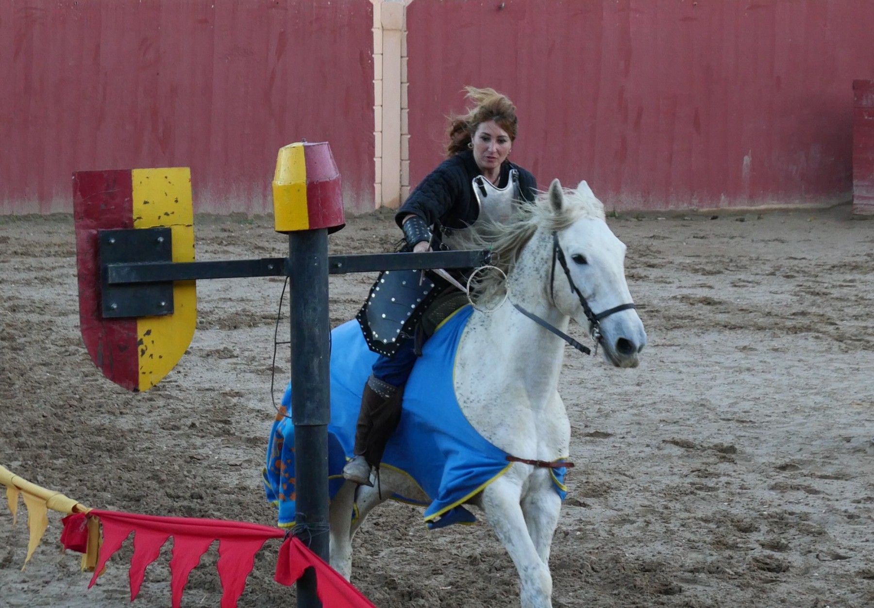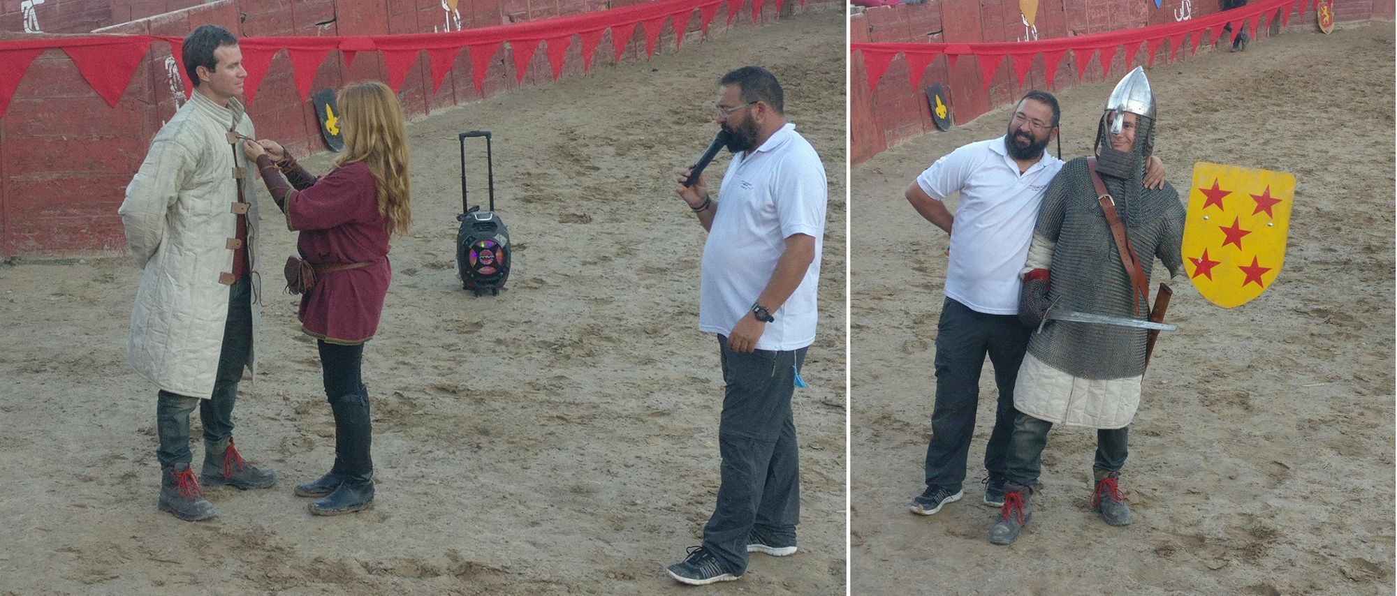 Algunos caballos, recuerdo sobre todo el de Irene y el del "Caballero Negro", iban engalanados. Mientras, Bene iba explicando cada prueba y amenizando más si cabe el espectáculo. En un momento dado, me pidió que bajara con él y me usó de maniquí viviente para vestirme de caballero medieval, con gambesón y almófar aparte de yelmo y cota de mallas. Fue muy divertido, tan divertido como pesada era la armadura, aunque entiendo que alguien entrenado en el arte marcial sabría moverse con cierta soltura y aguante durante largos periodos de tiempo.