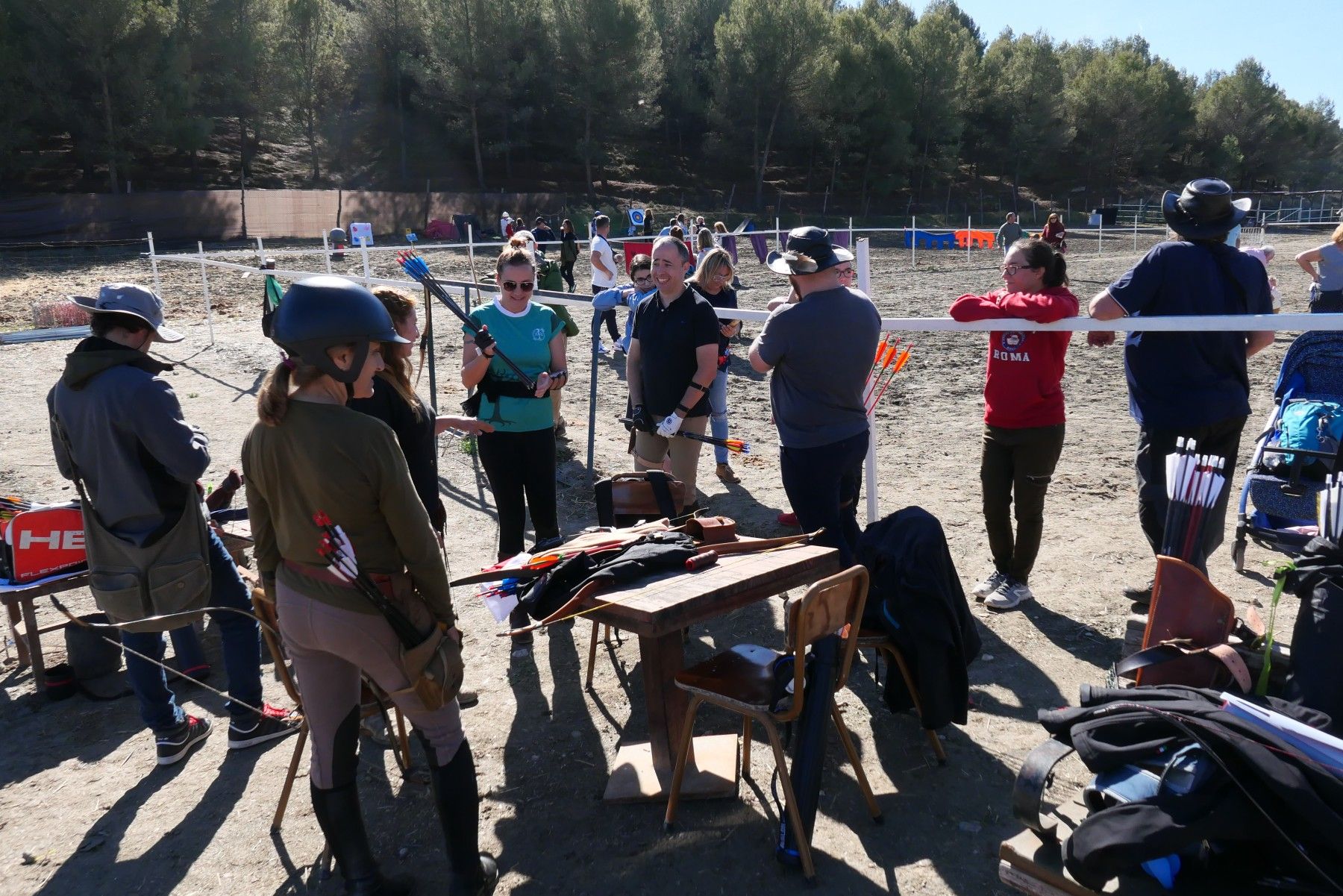 Participamos once personas (cinco mujeres, seis hombres) con técnicas y arcos muy variopintos. Desde recurvos takedown hasta arcos longbow vikingos, pero todos con las mismas ganas de poder, a gran distancia, colocar sus 6 flechas por ronda alrededor de la estaca.