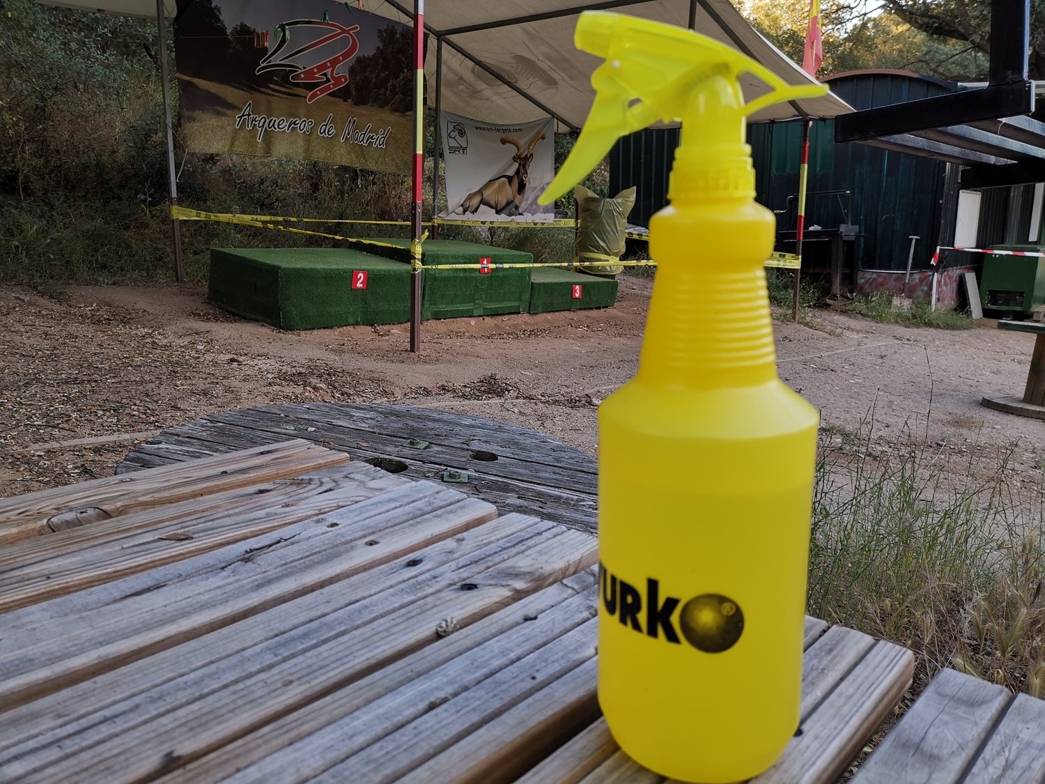 Lo más llamativo, con diferencia, eran los sprays desinfectantes al lado de cada diana para pulverizar la diana o el parapeto antes de extraer las flechas.