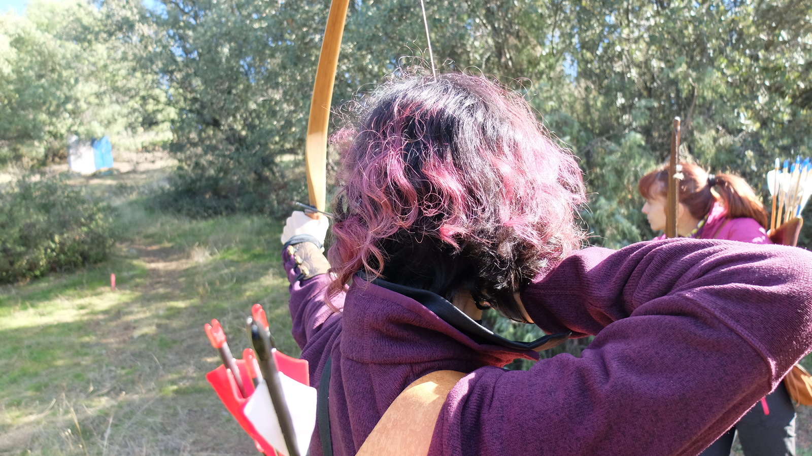 Tras una hora habíamos terminado con el primer recorrido y nos fuimos al punto de encuentro para beber un poco de agua, descansar e iniciar el segundo. Desafortunadamente, nuestras sospechas se confirmaron. Los arqueros de arco compuesto seguían enfrascados en su recorrido Estándar. Siendo sus tiros más lentos y tirando el doble de flechas estuvimos esperando hasta una hora. A la media hora, empezábamos a estar impacientes y fríos así que Angela y yo decidimos tirar unas flechas en el recorrido fijo para que yo no perdiera ritmo y para que ella volviera a calentar. En perspectiva, imagino que hubiera sido mucho mejor el otro orden de recorridos (poleas empezando en Hunter). También hubieramos esperado tras el segundo pero ya no tendríamos que tirar más flechas y estaríamos totalmente relajados.