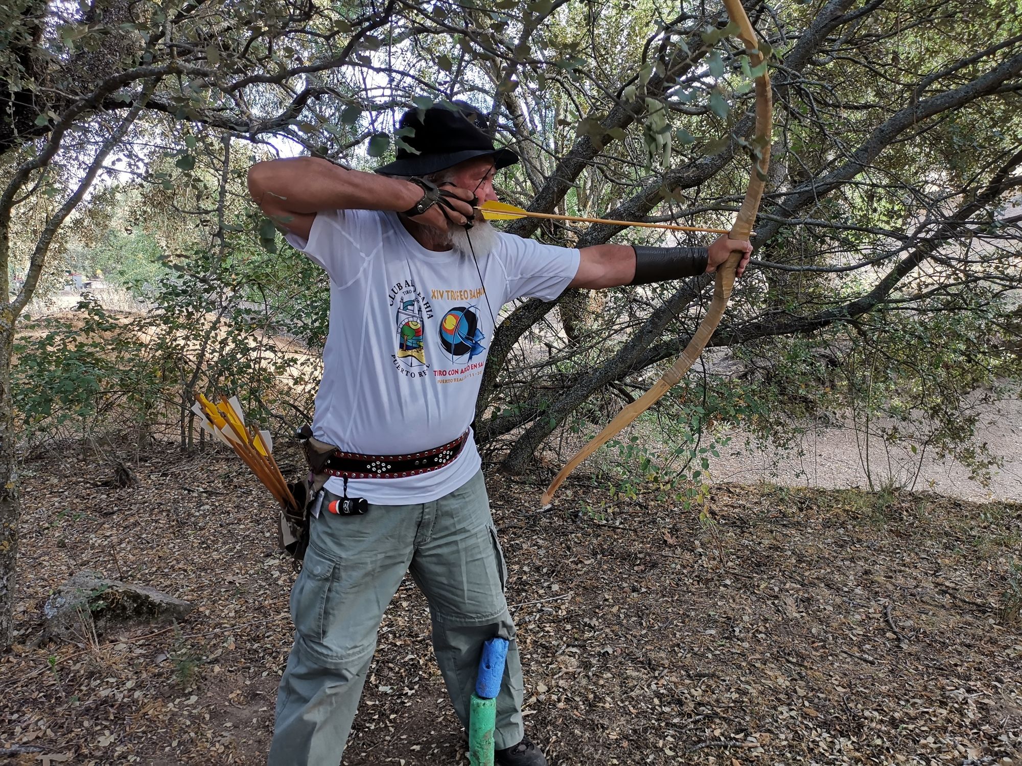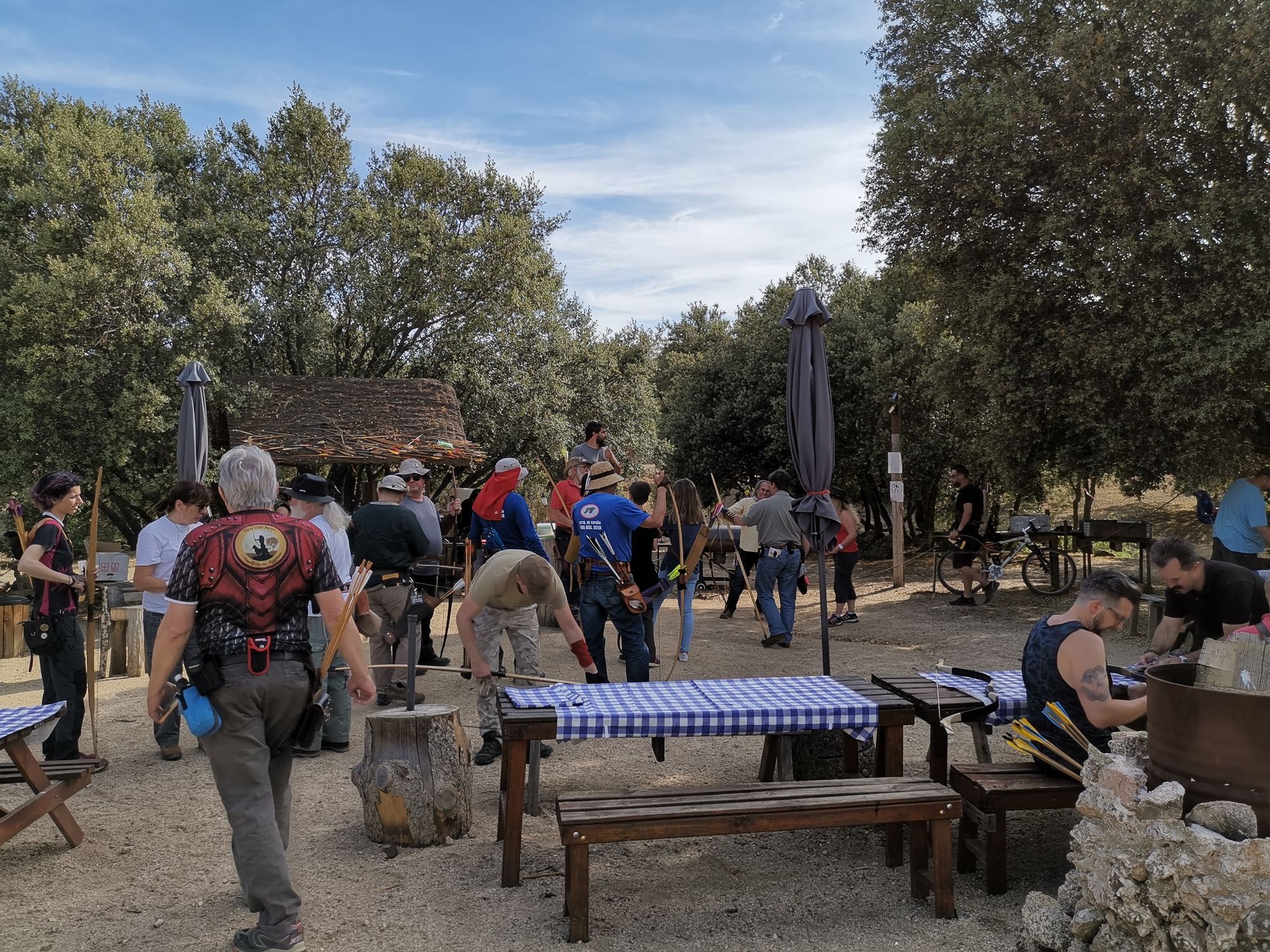Angela y yo llegamos poco antes de las seis y media al campo y ya había cierta energía arquera alrededor del campamento base, donde se arremolinaba la gente entre la barra, las mesas e infinidad de lugares para apoyarse o sentarse a la sombra de las encinas. Y es de esa atmósfera de la que merece la pena hablar en este último artículo de la serie destinada a dar a conocer la Liga de Arqueros Históricos, no tanto la tirada en sí.