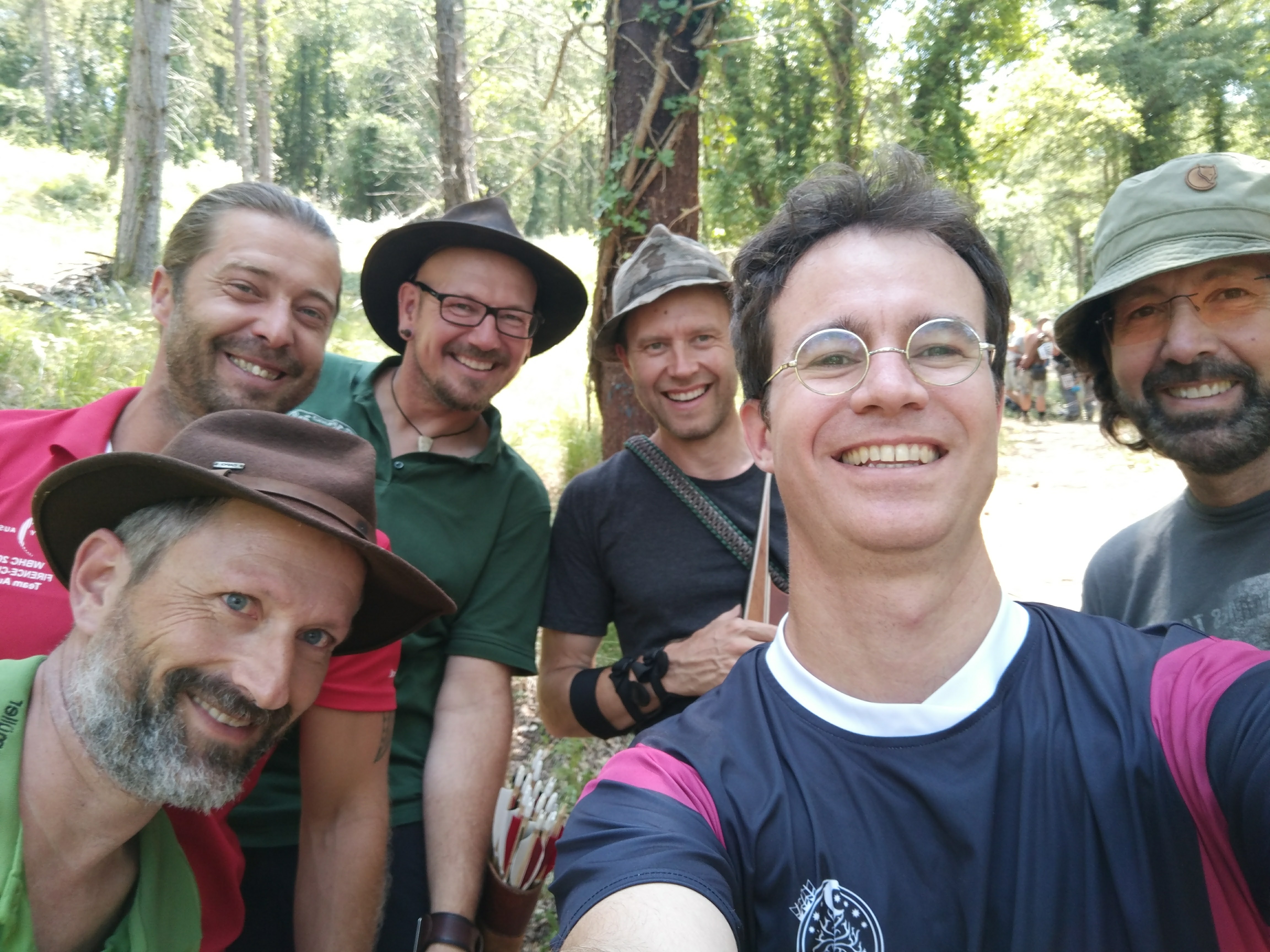 En este día tuve la fortuna de tirar con Jaco Wessels, de Timberpoint y también con Thomas Hohn, otro prometedor fabricante de arcos francés. También me reencontré con Pavel, el checo del primer día y con Carlo Bartolini del martes. Cerraba la patrulla Wolfgang "Wolfie" Adler como capitán. Tampoco en esta ocasión fui anotador o capitán. Fue una patrulla con un alemán, un italiano, un francés, un checo, un español y un sudafricano afincado en Estonia, una pasada en cuanto a nacionalidades. Siendo el tercer recorrido de cuatro, podría haber habido algo de tensión y menos compañerismo (eso me temía yo) porque en una ronda estándar, tirando igual que en la animal, las diferencias de puntos son más fuertes y no sería extraño que hubiera gente imaginando una buena remontada. No sé si la gente lo pensaba o no, pero en ningún momento hubo poca deportividad o disputas. El inglés fue el idioma de la patrulla salvo para Carlo, que se manejaba con gestos y compartía su frustración por un mal día conmigo.