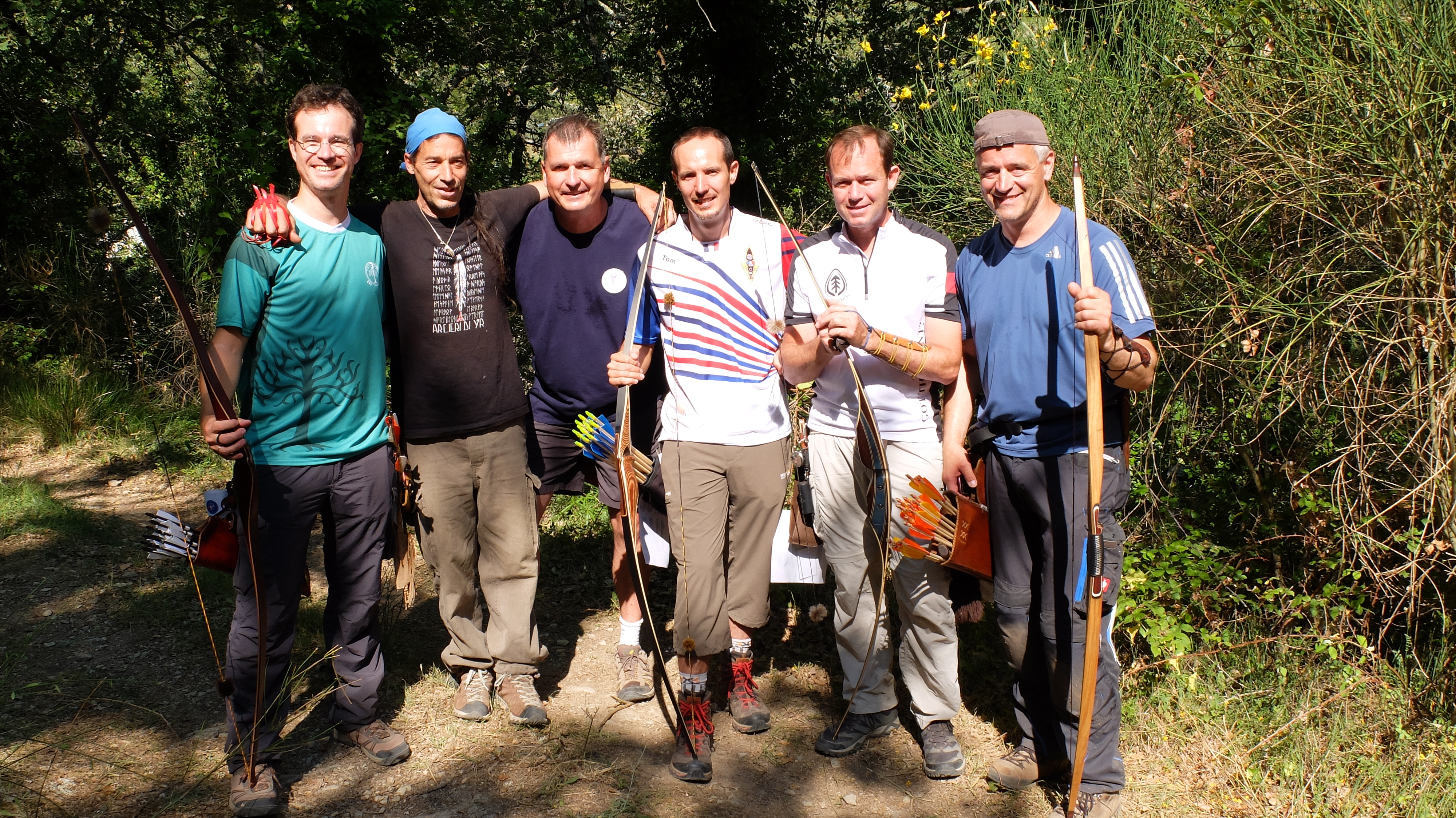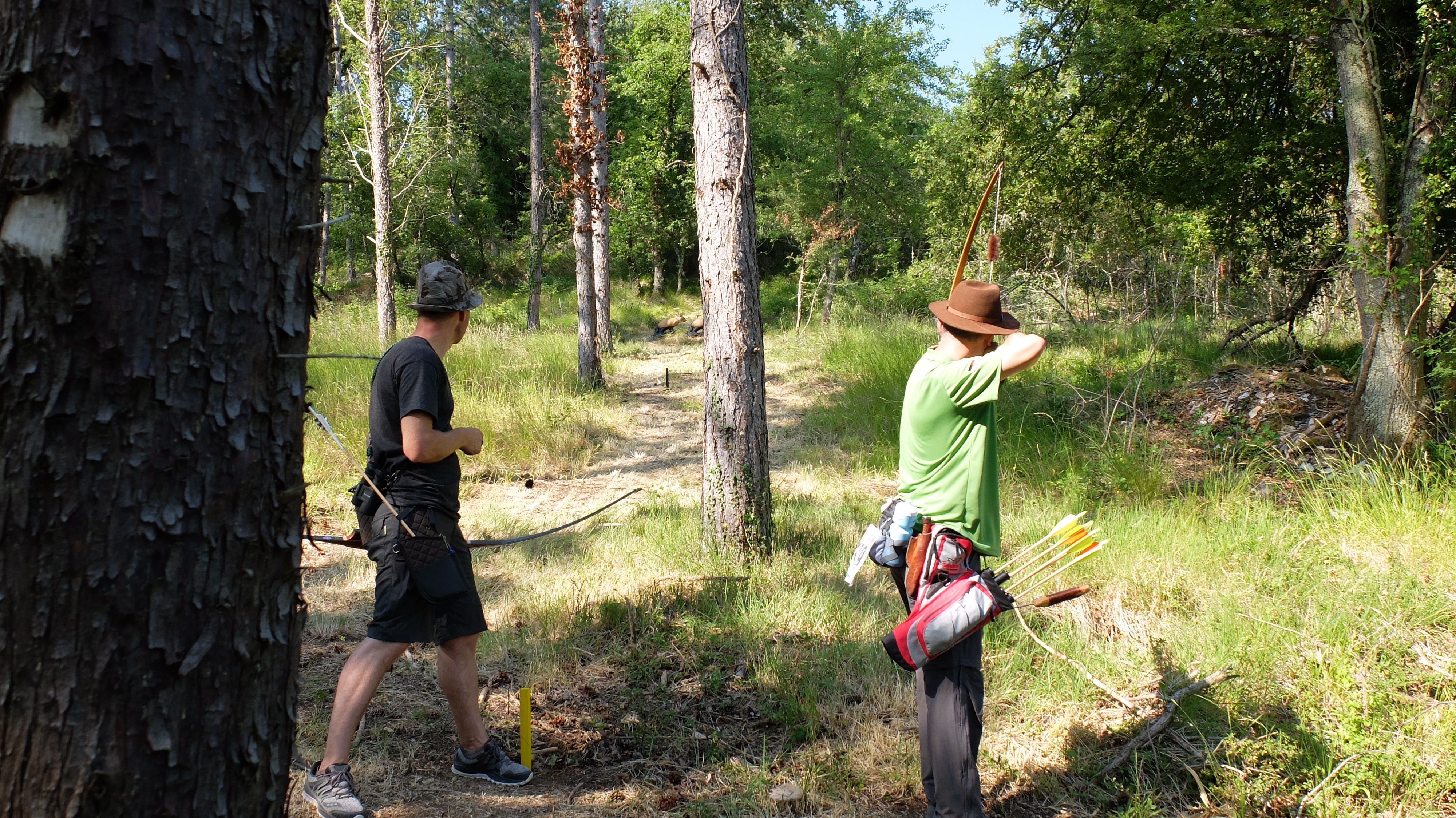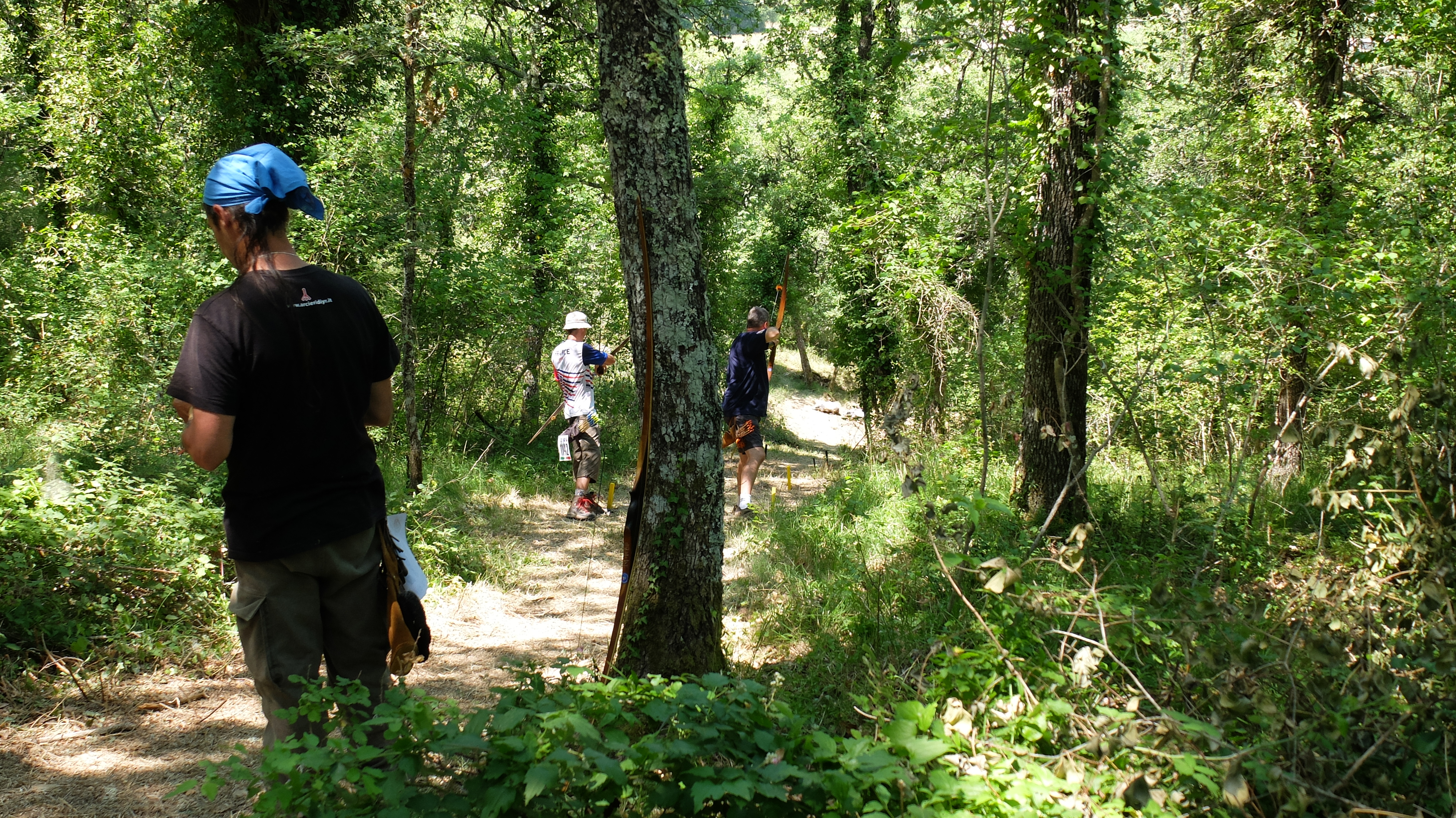 En este día tuve la fortuna de tirar con Jaco Wessels, de Timberpoint y también con Thomas Hohn, otro prometedor fabricante de arcos francés. También me reencontré con Pavel, el checo del primer día y con Carlo Bartolini del martes. Cerraba la patrulla Wolfgang "Wolfie" Adler como capitán. Tampoco en esta ocasión fui anotador o capitán. Fue una patrulla con un alemán, un italiano, un francés, un checo, un español y un sudafricano afincado en Estonia, una pasada en cuanto a nacionalidades. Siendo el tercer recorrido de cuatro, podría haber habido algo de tensión y menos compañerismo (eso me temía yo) porque en una ronda estándar, tirando igual que en la animal, las diferencias de puntos son más fuertes y no sería extraño que hubiera gente imaginando una buena remontada. No sé si la gente lo pensaba o no, pero en ningún momento hubo poca deportividad o disputas. El inglés fue el idioma de la patrulla salvo para Carlo, que se manejaba con gestos y compartía su frustración por un mal día conmigo.