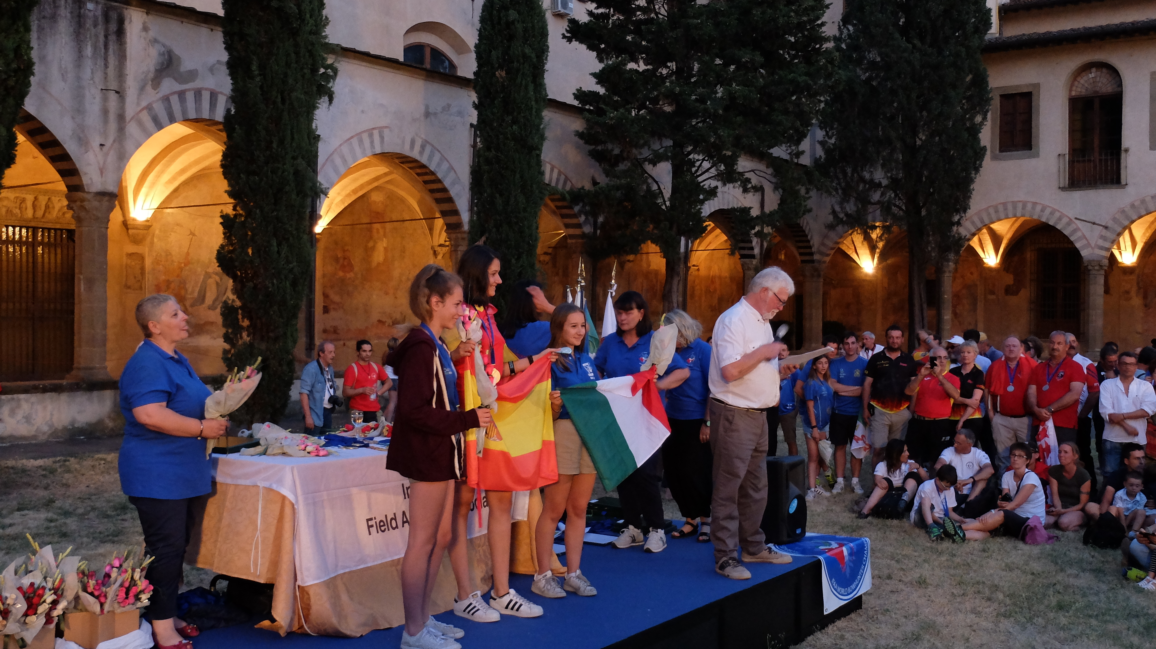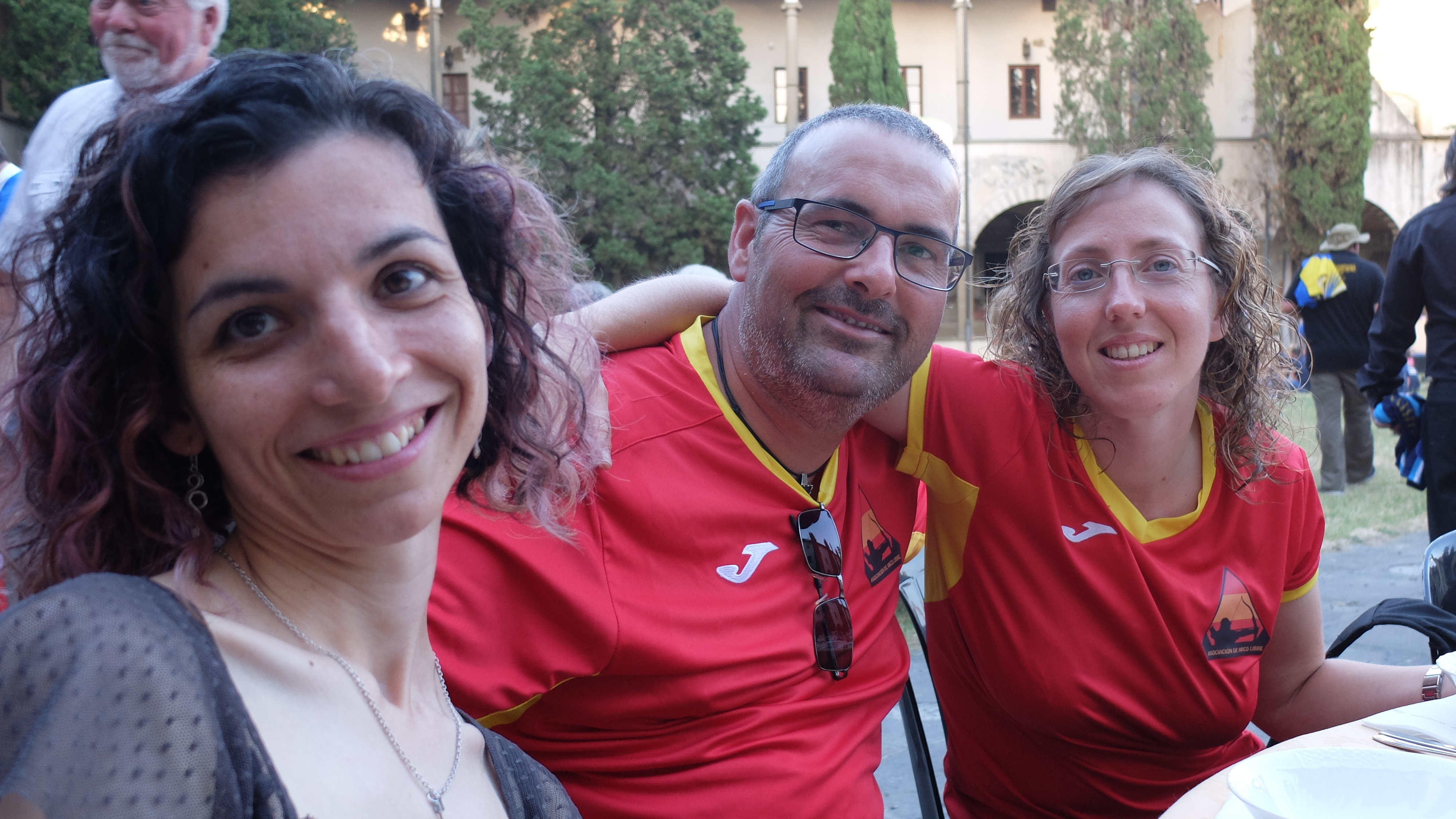 En primer lugar, la megafonía era muy débil y salvo que estuvieras a unos pocos metros de la tarima, no oías nada, sólo a alguien gritando cosas ininteligibles. Segundo, empezaron con los premios a los equipos nacionales (los países con la participación en medallas más destacada) pero por mucho que llamaron a Suiza, a Alemania y a Italia, allí no apareció nadie porque nadie entendía qué estaba pasando. Eso se pudo llevar 20 minutos directamente hasta que lo resolvieron. Luego empezaron ya con las categorías propiamente dichas y ahí básicamente le cambiaban la nacionalidad a uno de cada tres arqueros o arqueras. Recuerdo un caso muy llamativo en donde una Young Adult no me acuerdo de qué categoría, de Suiza, que había ganado el bronce, se encaró con el chairman de IFAA porque había dicho que era de Estonia. Tenía un enfado la muchacha que vamos... Mientras tanto, el chairman pedía perdón entre risas. No me he olvidado de la cena pero parece que la organización sí que lo hizo o dio instrucciones de no darnos de cenar hasta que la ceremonia de premios no estuviera bien avanzada (eso imagino, para que la gente de pie aplaudiendo no se quedara sin cenar). El caso es que el aperitivo llegó como a las 21h y el primer plato a las 22h, no exagero un pelo. La ceremonia terminó a las 23h y la cena a la misma hora. La cena estaba muy rica, eso lo teníamos claro todos, pero lo que no entendimos es por qué se empeñaban en servir a los asientos vacíos una y otra vez. Había mesas vacías con 12 platos con lasaña que habían sido servidas antes que nuestra mesa en donde había gente de carne y hueso. En fin, lo que hicimos para paliar esta forma de tratar la comida (espero que no la tiraran luego) fue repetir de nuestros compañeros comensales fantasmas.