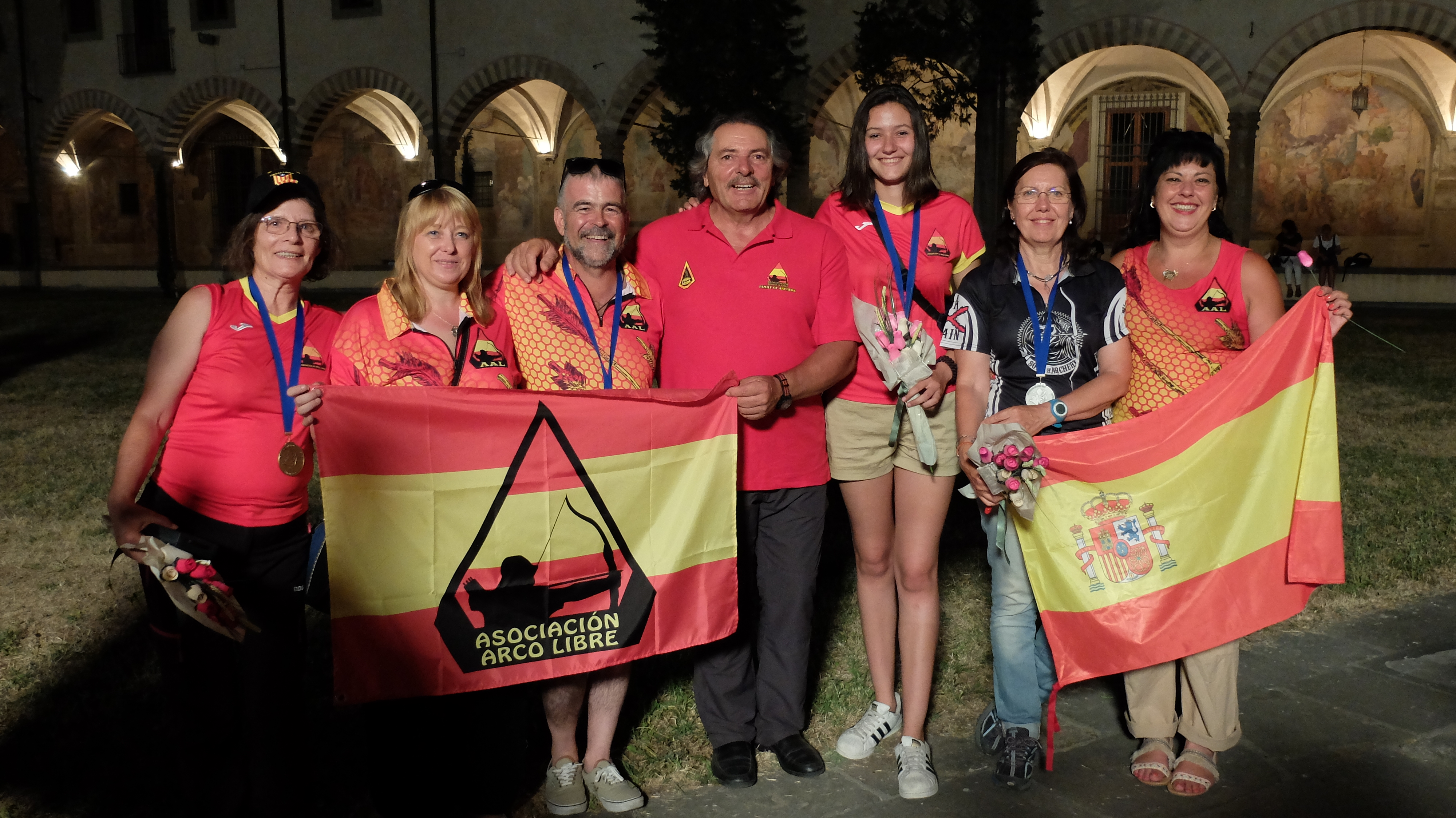 De izquierda a derecha, Isabel (bronce en Veteran Female Freestyle Unlimited), Mónica, Juanjo (bronce en Veteran Male Bowhunter Compound), José Luis Hervás, Nora (oro en Junior Female Traditional Bow), Begoña (plata en Veteran female Traditional Bow) y Natalia.