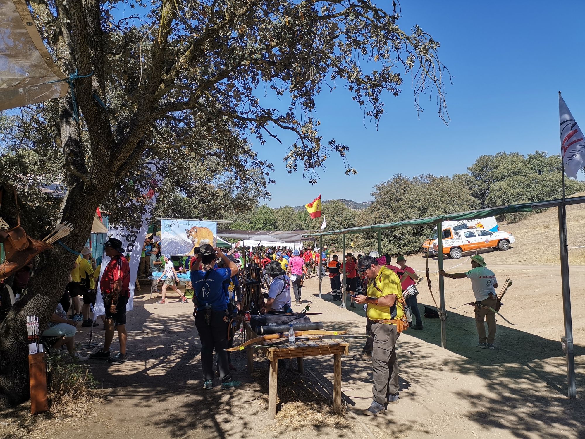 Y el reflejo de toda esa cantidad de vehículos vino en forma de algarabía de equipaciones deportivas y arcos y flechas de todos los tipos en cuanto llegué a la caseta y la línea de calentamiento. Lo primero que me impactó fue el hormiguero que era eso, gente tirando, gente charlando, gente moviéndose entre las flechas y los arcos del resto como solo un arquero sabe hacerlo, todo el mundo de forma armoniosa en un espacio relativamente reducido, como si les hubieran dicho "de aquí no se puede salir" y ahí obedientes estuvieran todos buscando su hueco. Por el extremo del fondo los más avispados se habían buscado un extra de confort y andaban más "sueltos", curiosamente alejados de una de las grandes sorpresas del día, la instalación de unas carpas bien hermosas que horas más tarde servirían de bendito refugio para protegerse de la solanera.